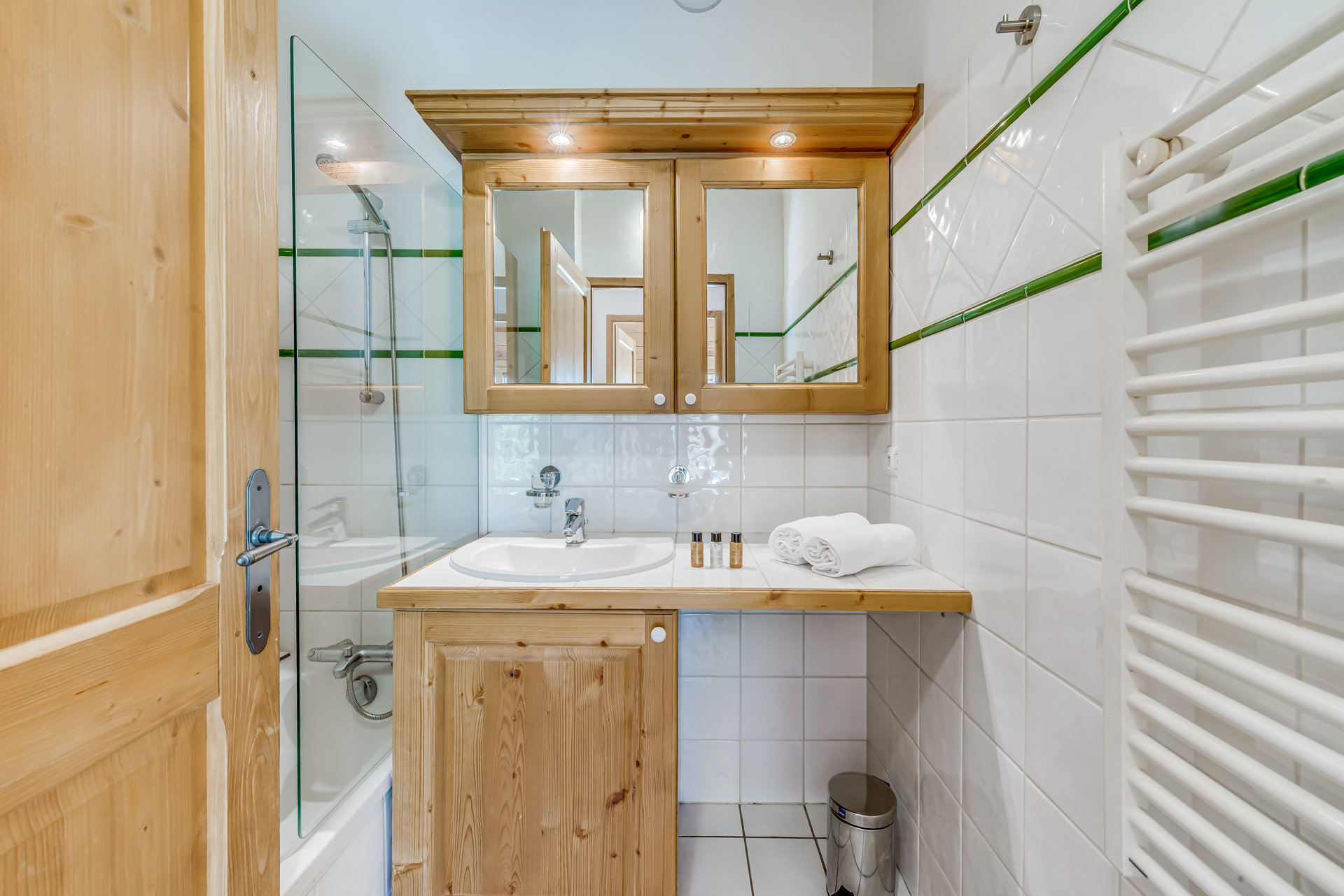 - 1 Salle de bains, avec baignoire, meuble vasque, radiateur seche serviettes.