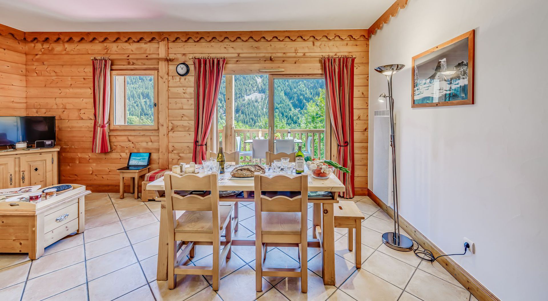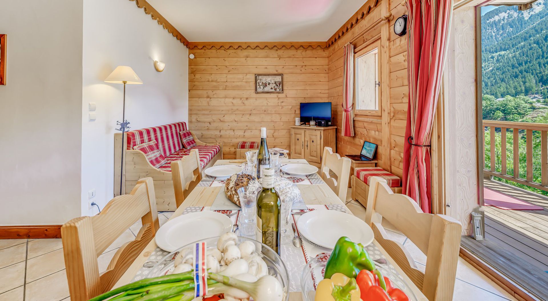 - 1 Balcon/terrasse SUD, deck bois avec tables et chaises et vue sur la Vanoise et Courchevel