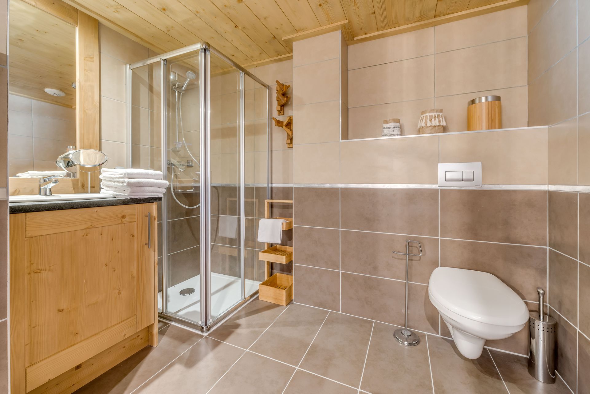 * Salle de bains avec WC : douche, meuble vasque, seche serviette, seche cheveux, lave linge.