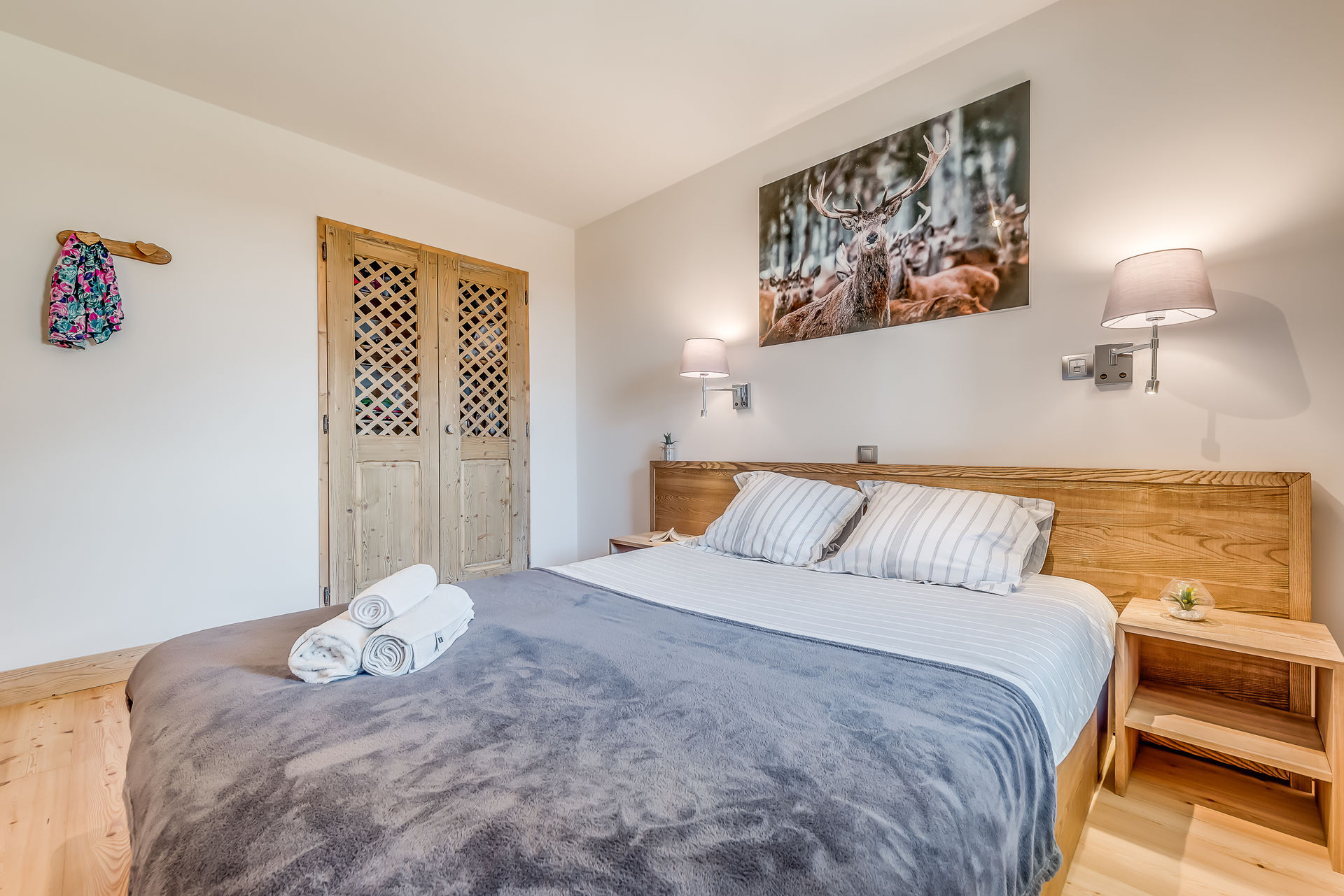 * Chambre : lit double (160x200), chevets, lampes de chevet, placard avec étagère et penderie