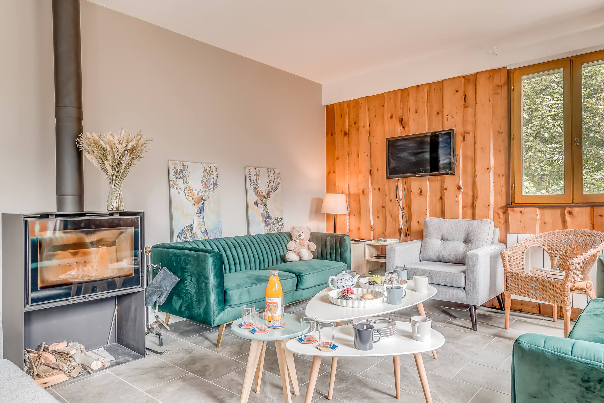 - un séjour avec 2 canapés, fauteuils, poèle à bois, télévision écran plat