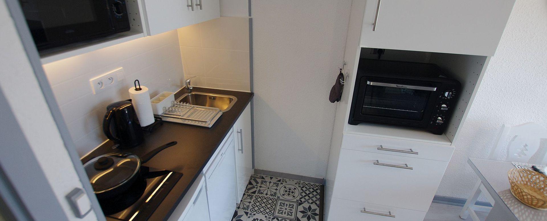 - d'une kitchenette équipée d'un lave-vaisselle, four, micro-ondes, 2 pl. induction, réfrigérateur, cafetière électrique, grille-pain, bouilloire et vaisselle complète.