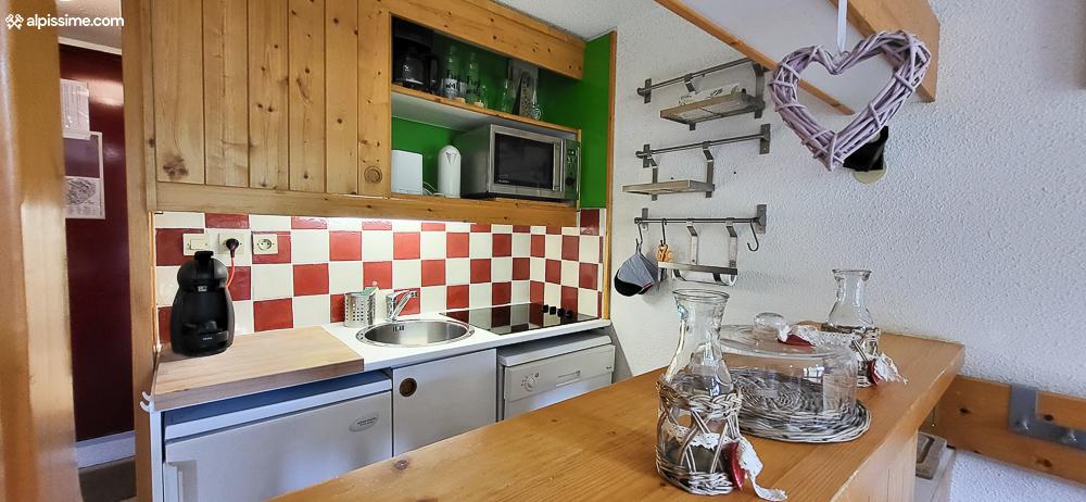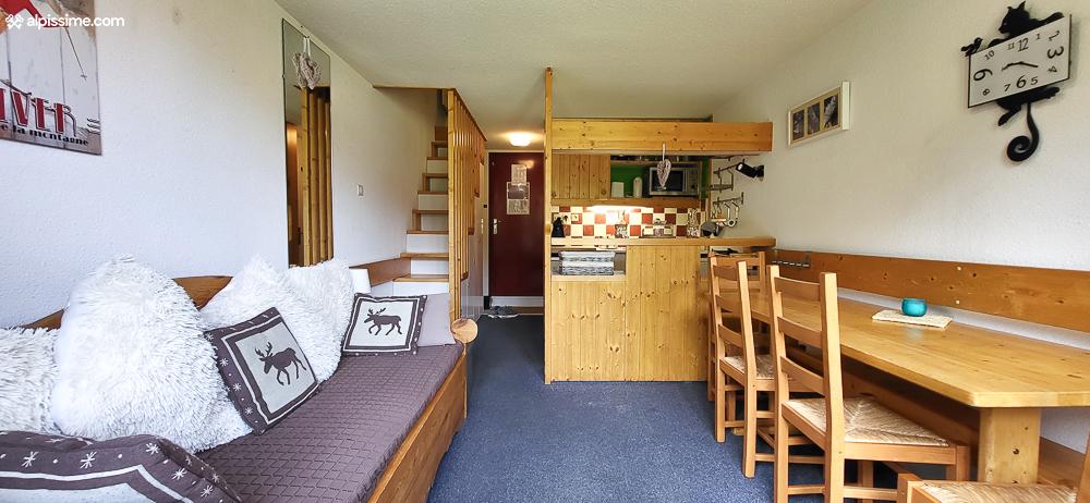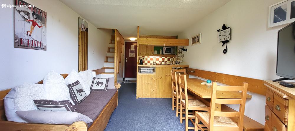 - Une pièce de vie avec cuisine ouverte sur un séjour lumineux, accueillant une banquette gigogne (2 couchages, se mettent à hauteur pour former un lit double)