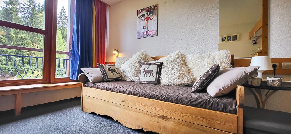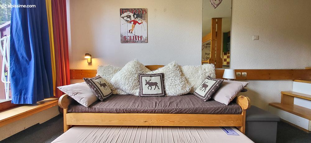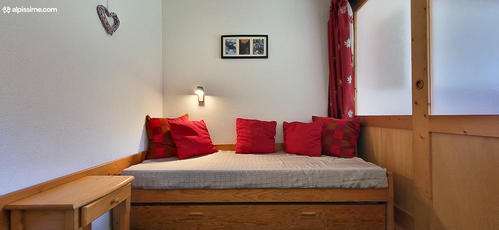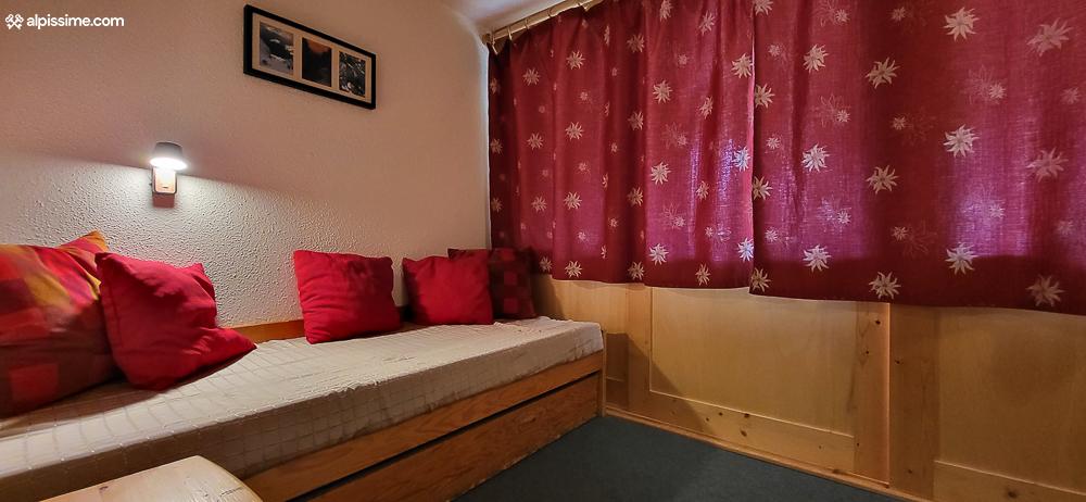 - Une antichambre accueillant un canapé-lit gigogne pour 2 personnes, qui ferme par une cloison amovible et un rideau,