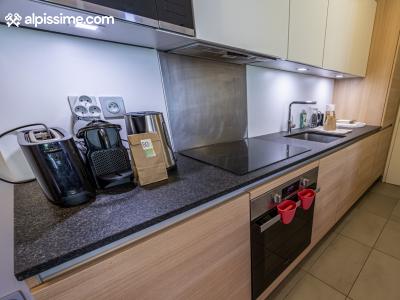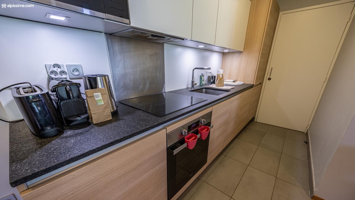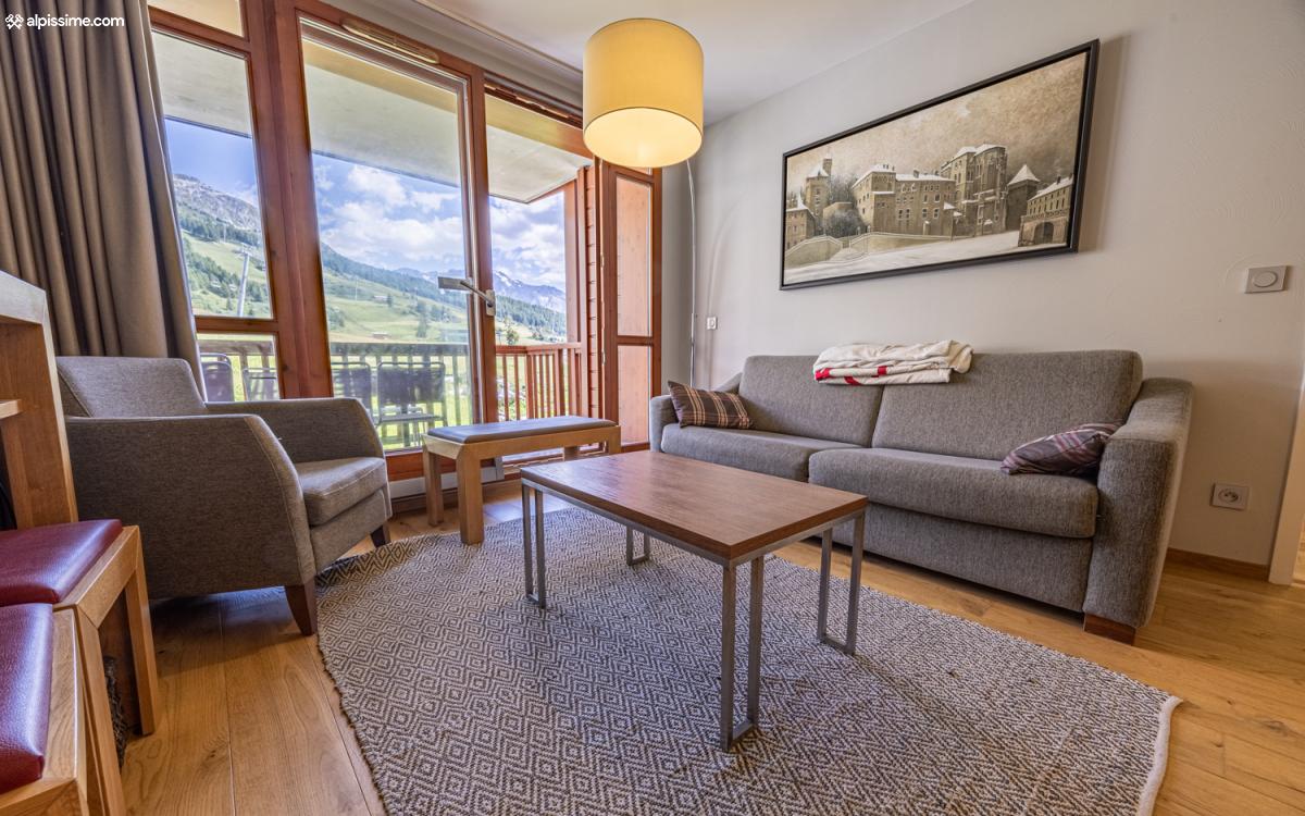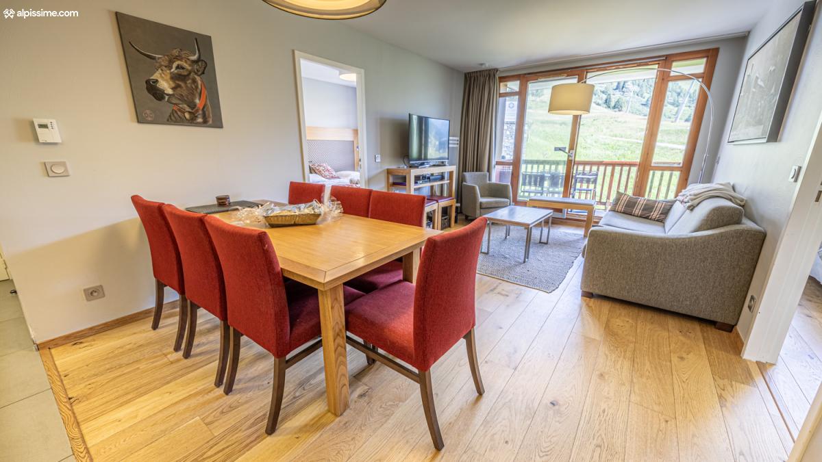 - Une spacieuse pièce de vie avec cuisine ouverte entièrement équipée, donnant sur une terrasse permettant de profiter des vues de la Tarentaise et des pistes du domaine Paradiski
