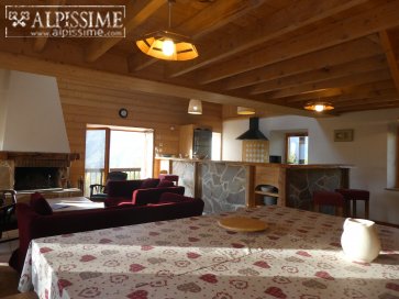 la grande pièce principale dispose d'1 cuisine américaine, bien équipée pour mijoter de bons repas, un coin salle à manger avec deux grandes tables de bois, un autre coin salon avec deux canapés et fauteuils en cuir, autour de la cheminée, le tout éclairé par les baies vitrées et balcons, la vue sur la nature environnante et la montagne est vraiment unique.