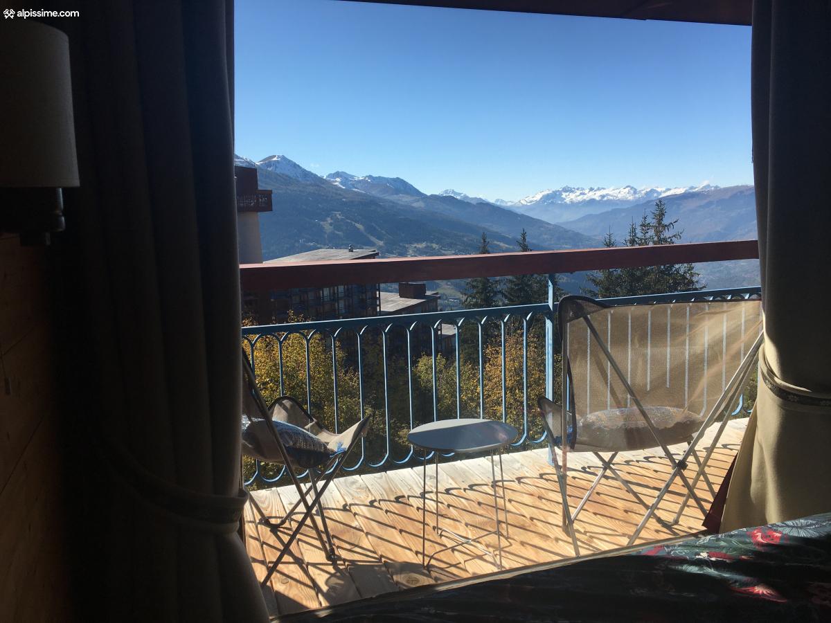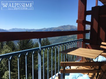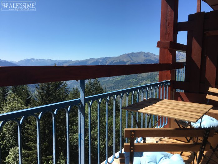 * Large balcon orienté sud-ouest, belle vue sur la vallée : 2 tables bistro, 2 chaises et 2 transats, 1 banc