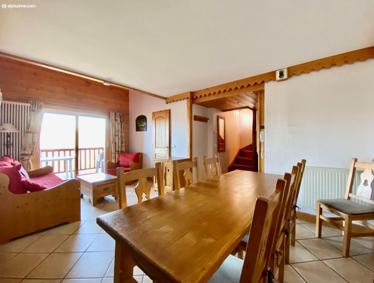 L’appartement, exposé ouest, peut accueillir jusqu’à 8 personnes. Il dispose d’une vue panoramique sur les montagnes et le Mont-Blanc : mémorables couchers de soleil garantis !