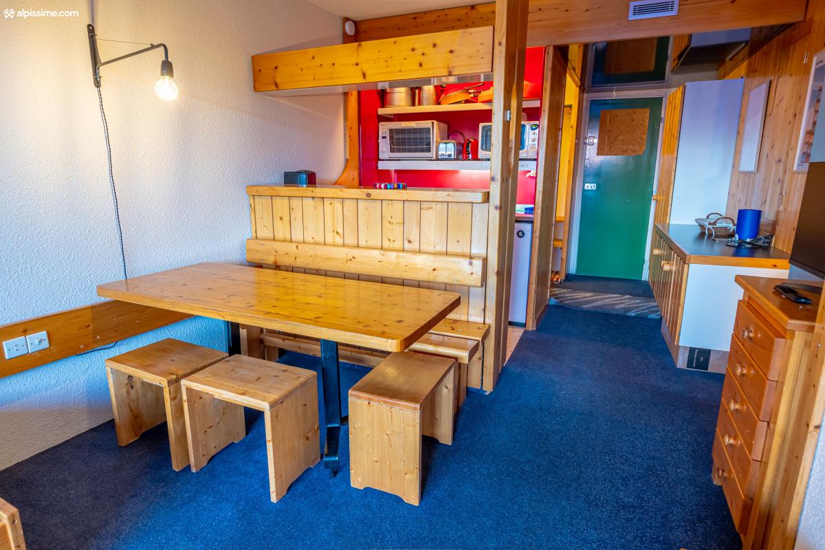 - Un espace de vie agréable avec une cuisine ouverte sur un salon lumineux, équipé d'une banquette gigogne et d'une banquette simple, parfait pour se détendre après une journée de ski,