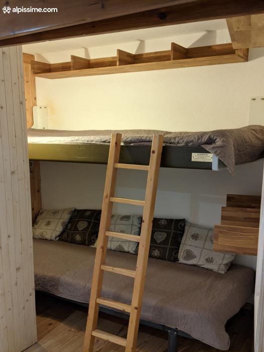 Coin montagne avec 2 lits superposés, séparé du séjour par une porte coulissante et un rideau.