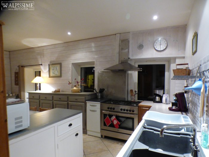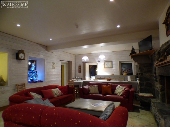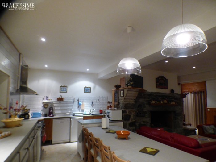(une imposante cheminée de pierres dans le séjour, une discrète déco chalet),