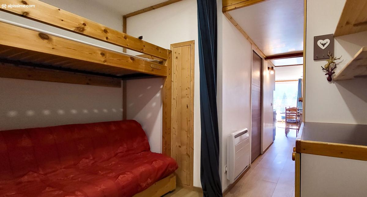 - Un coin montagne accueillant un canapé-lit 2 personnes ainsi qu'un lit superposé pour une personne