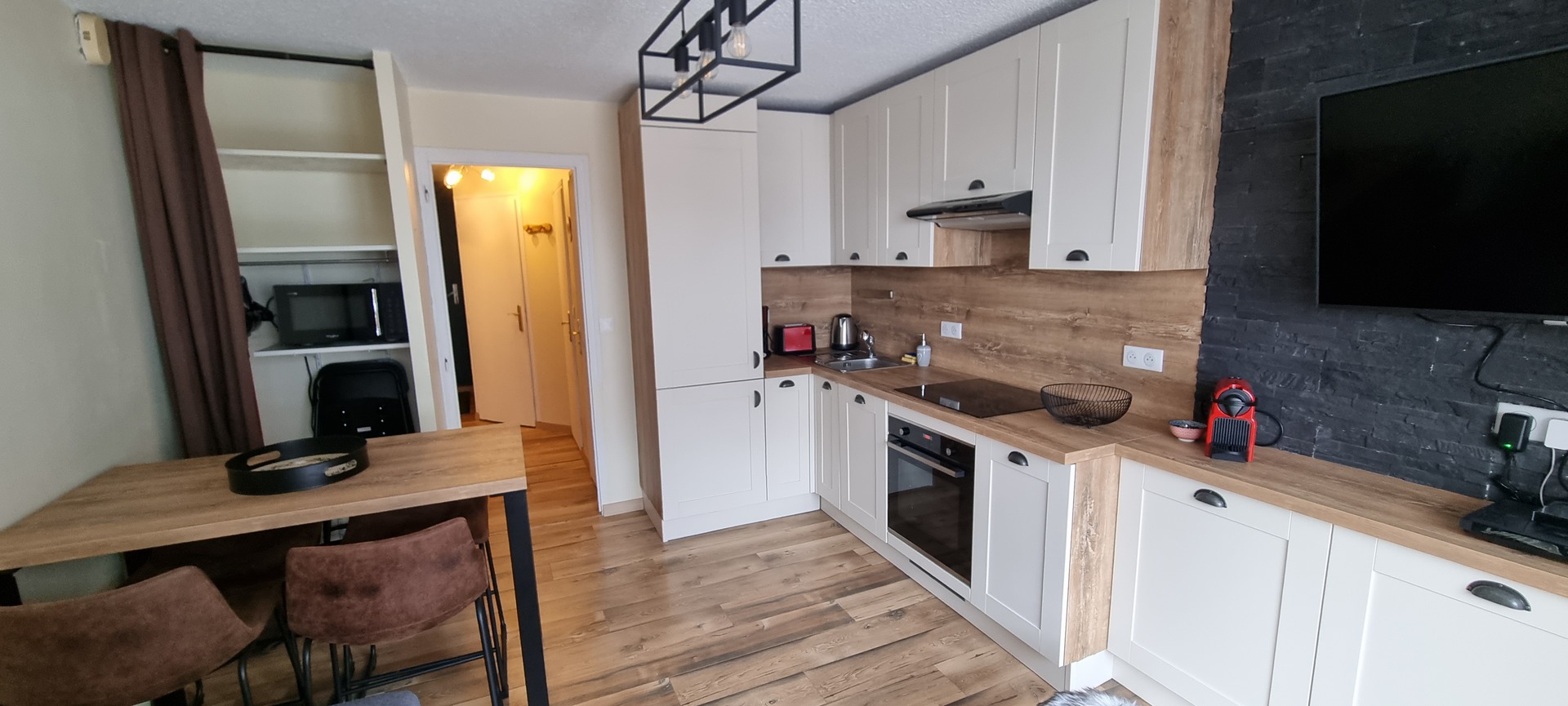 L'appartement a pour equipement, une cuisine toute equipee contenant une plaque a induction, un four traditionnel, un four micro-onde, une cafetiere capsule krups, une cafetiere filtre, un bouilloir, un grille-pain, un appareil a raclette+ gril, un appareil a fondu, un plat a tarte, une essoreuse a salade, une planche a decouper, un mixeur electrique et d'un lave-vaisselle.