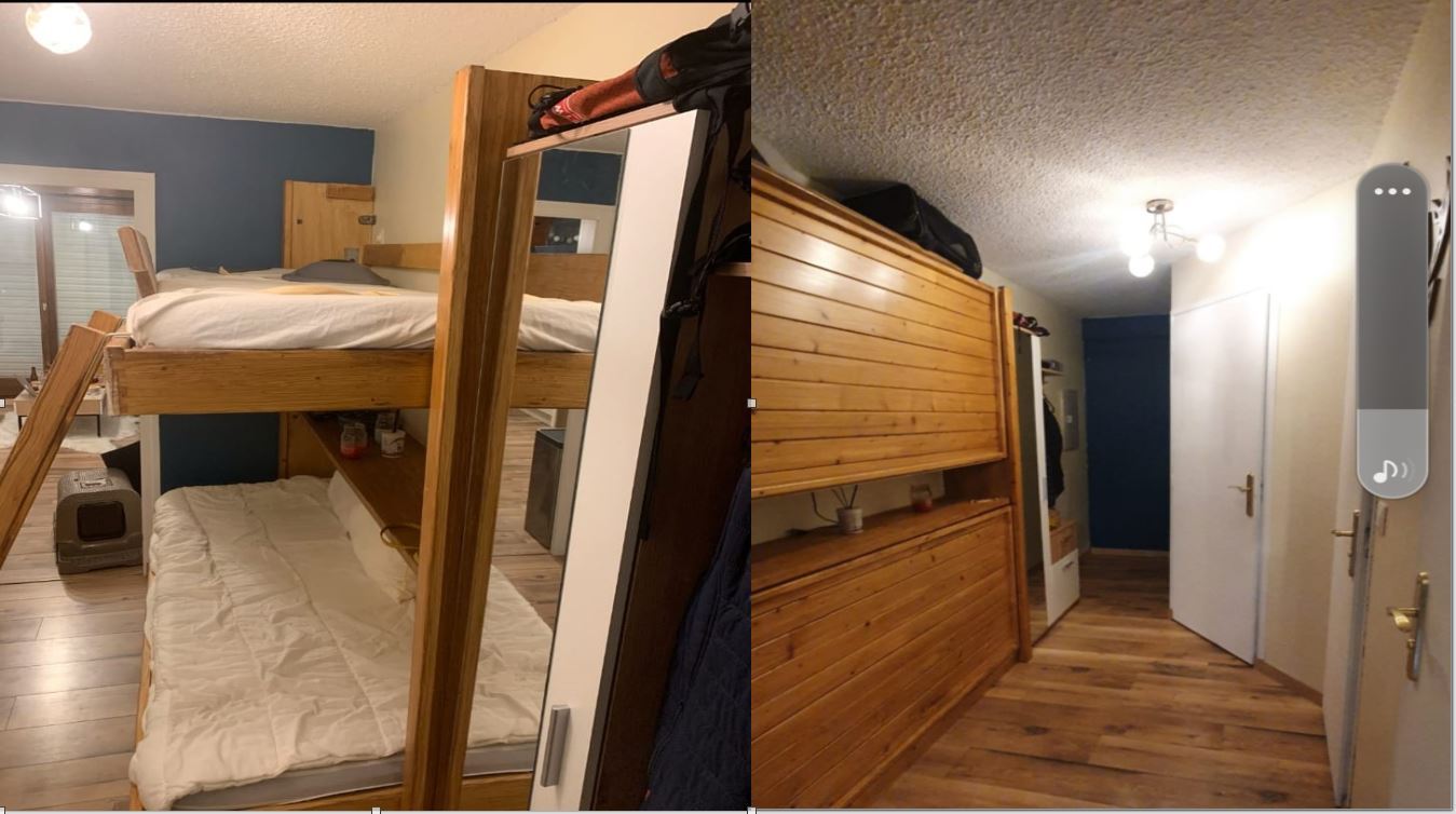 A l'entree, un coin montagne avec 2 lits rabattables mesurant 80x200, puis, une chambre avec un lit double ayant comme mesure 140x200 avec coffre de rangement inclus, et un canape lit de 140x200 dans le sejour.