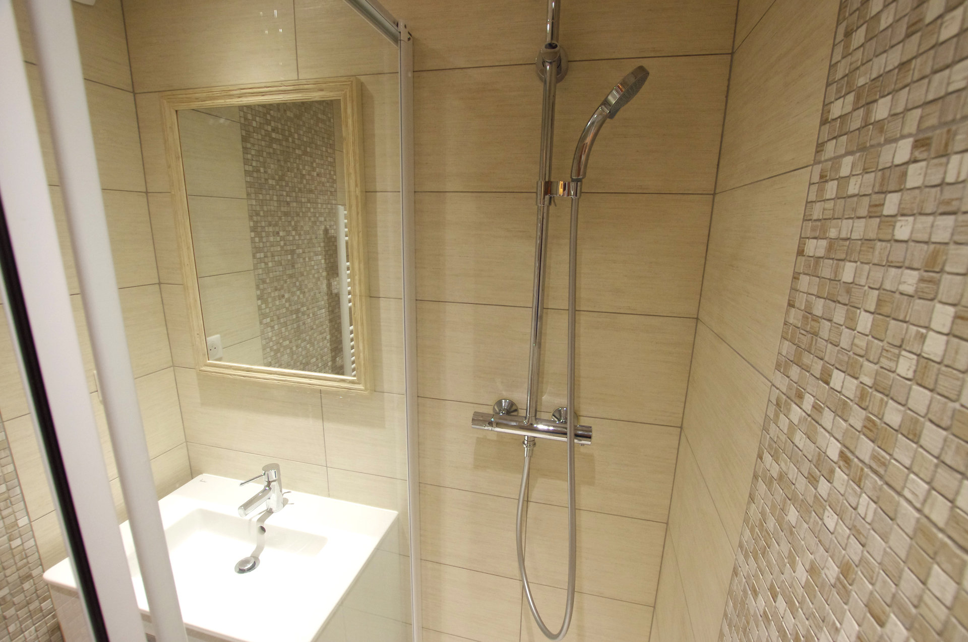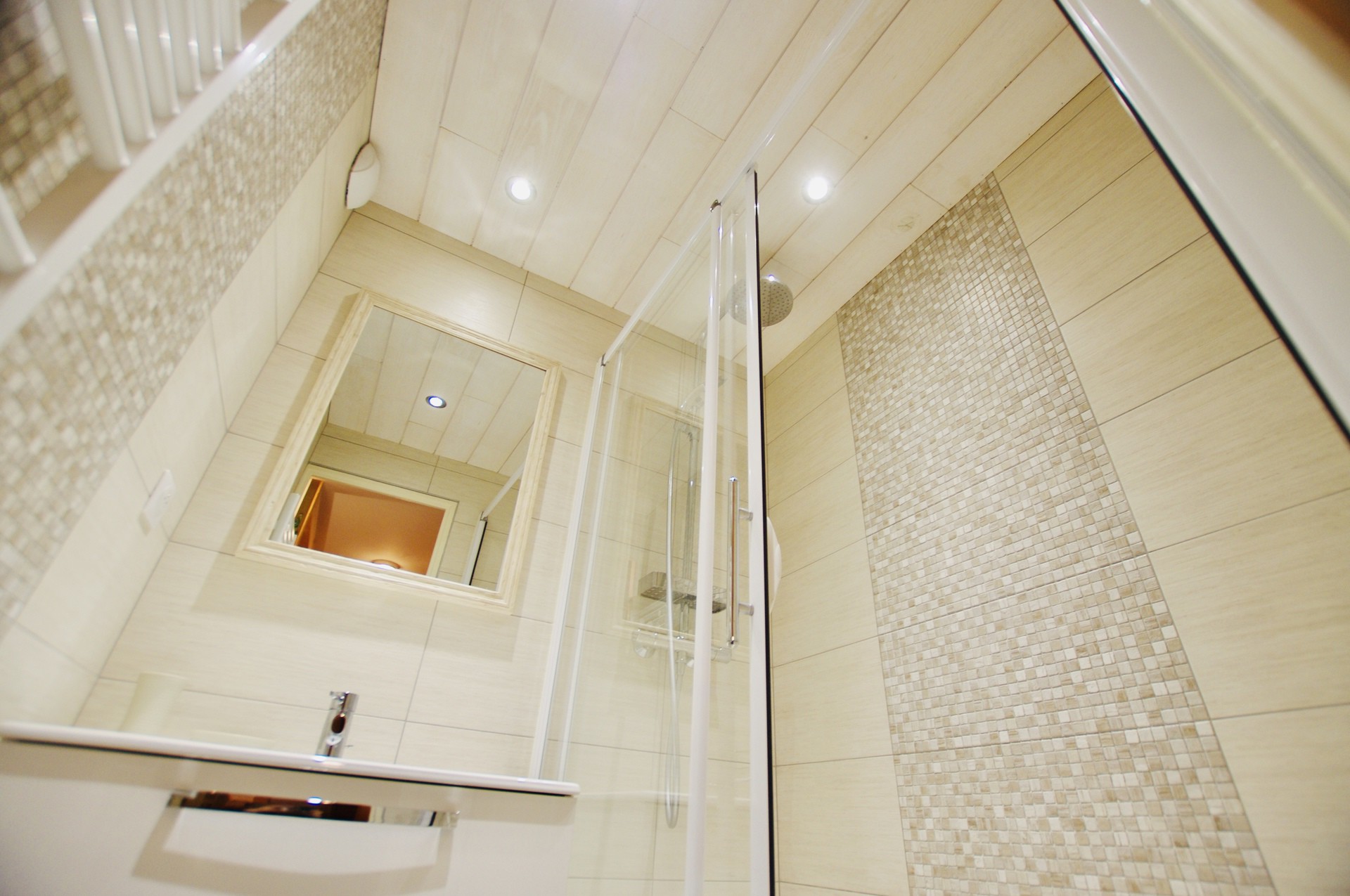 - Salle de bain avec douche a l'italienne, meuble vasque, radiateur seche-serviettes.