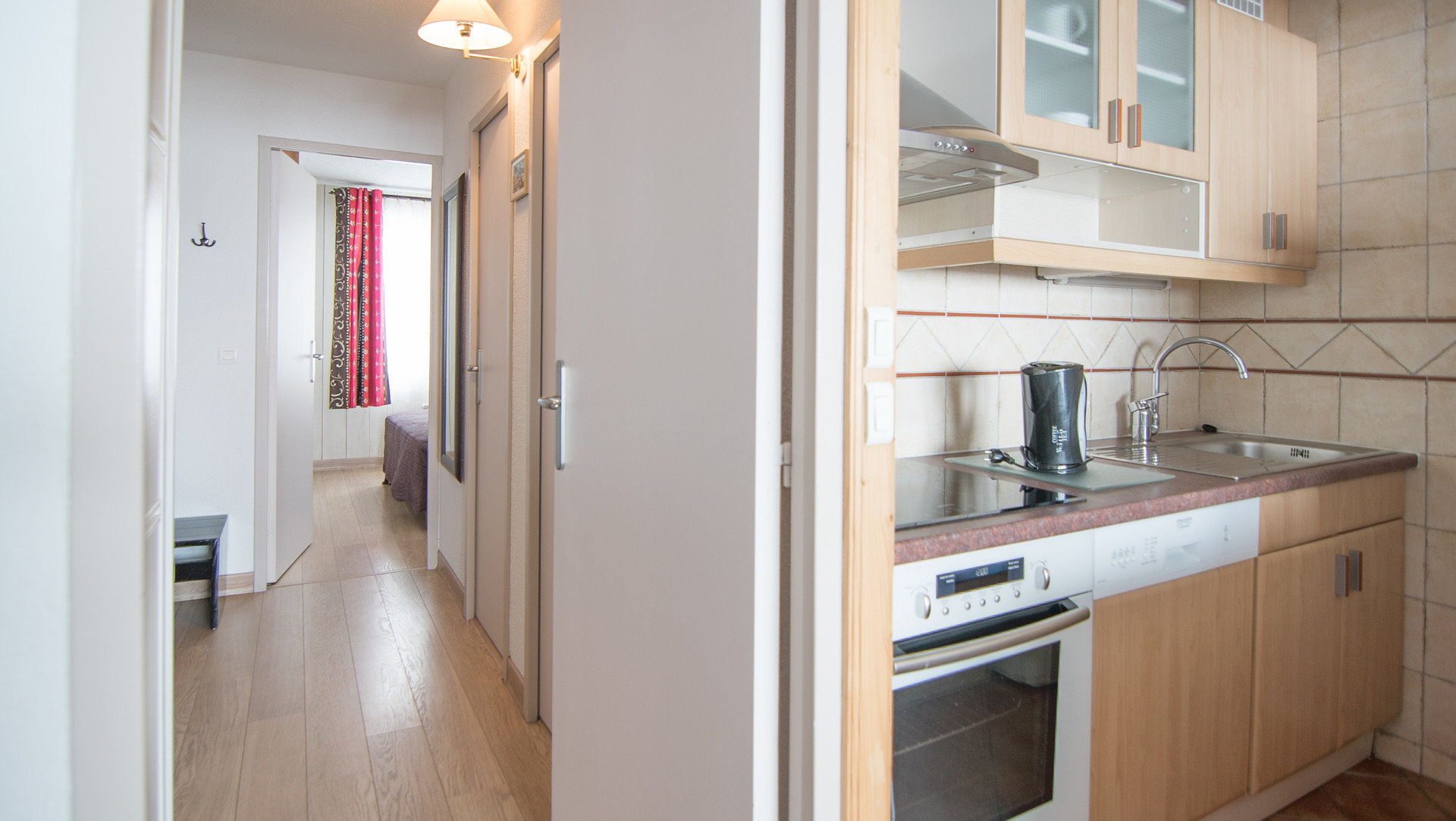 Cuisine : Plaques vitrocéramiques, four, réfrigérateur, congélateur, lave-vaisselle et cafetière à filtre.