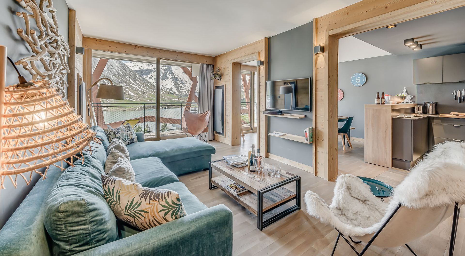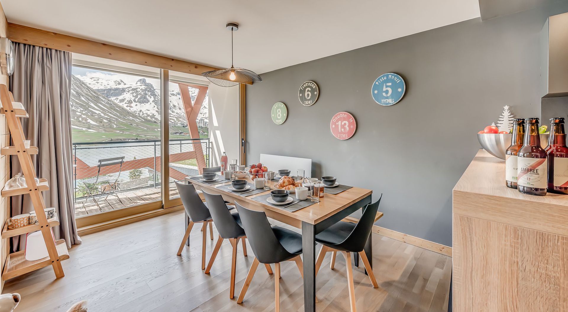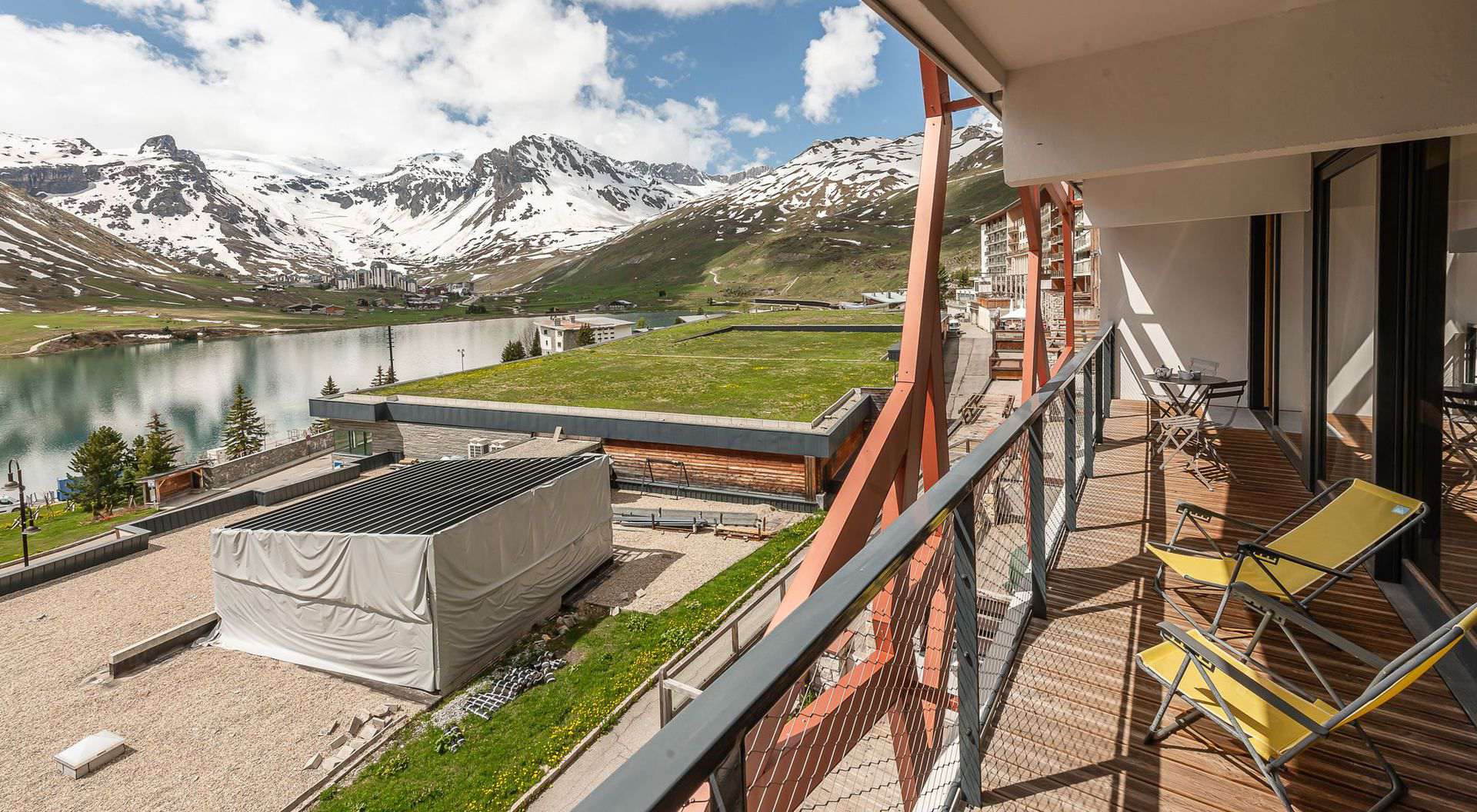 Il possede un balcon exposee plein sud, avec vues exceptionnelles et degagees sur le lac naturel de Tignes, les massifs de Toviere et le glacier de la Grande Motte
