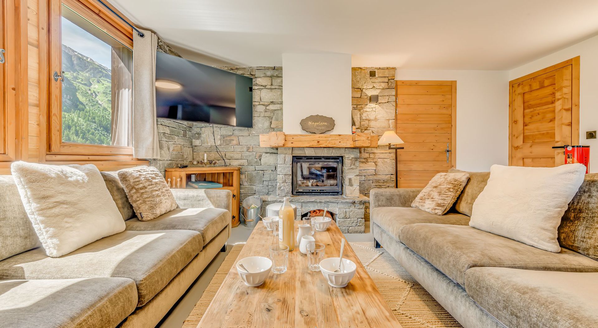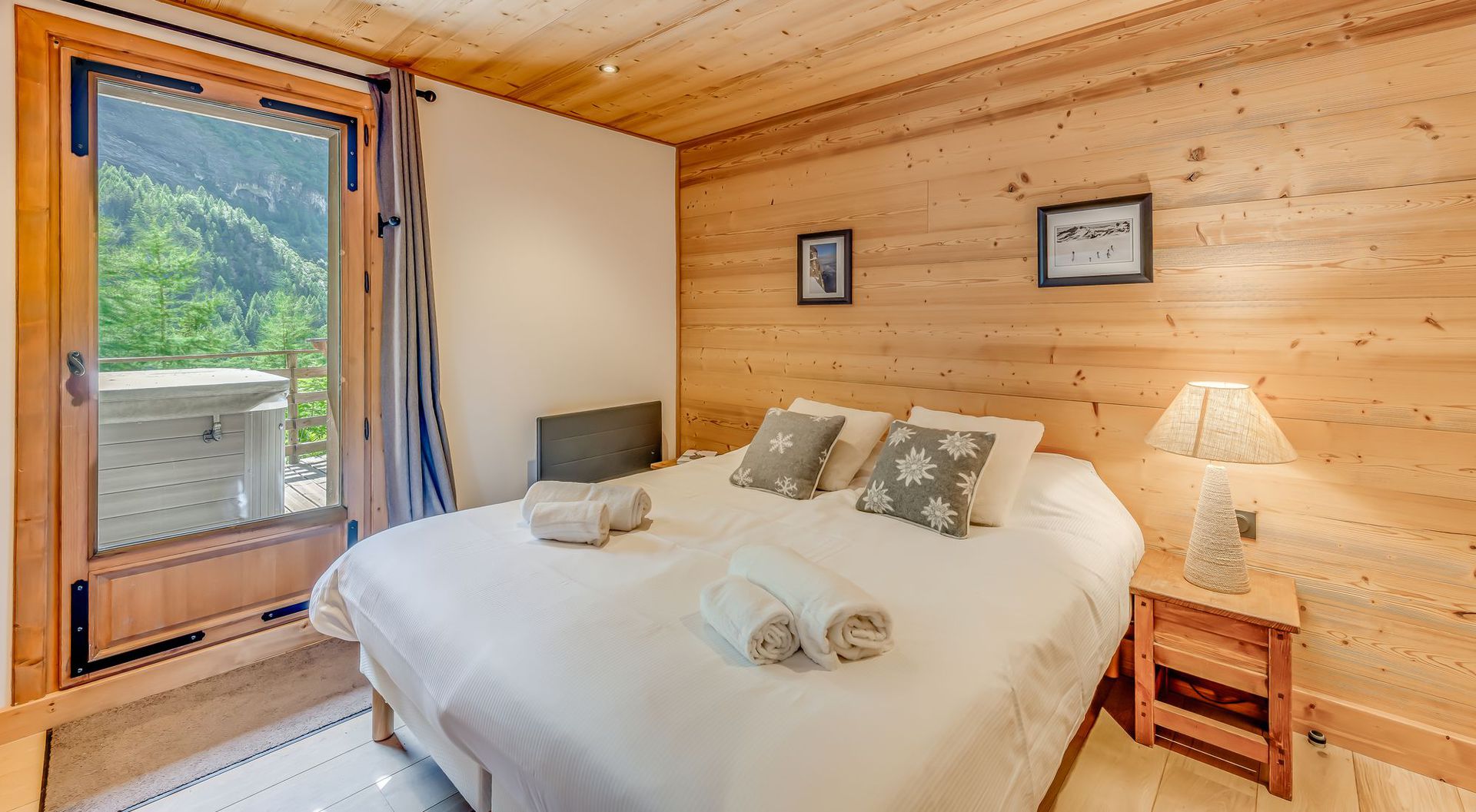 Le chalet Napoleon - 108m2 - 6 pieces 10 personnes. Gamme CHALET dispose de 5 chambres chacune avec salle de bain, d'un jacuzzi, il est situe a 200 metres des remontees mecaniques et du centre du village par un ascenseur qui relie le quartier du Belvedere ou se situe le chalet au centre du village (commerces, bars, restaurants...) et aux remontees mecaniques (telecabine des Brevieres). Il beneficie d'une vue epoustouflante sur les montagnes et les pistes.
