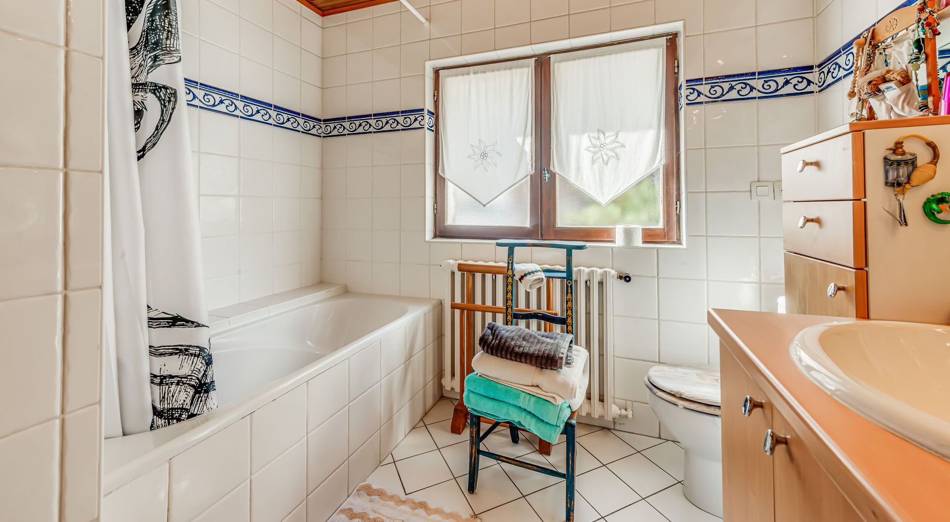 - 1 Salle de bains avec baignoire, meuble vasque, radiateur seche serviettes et WC