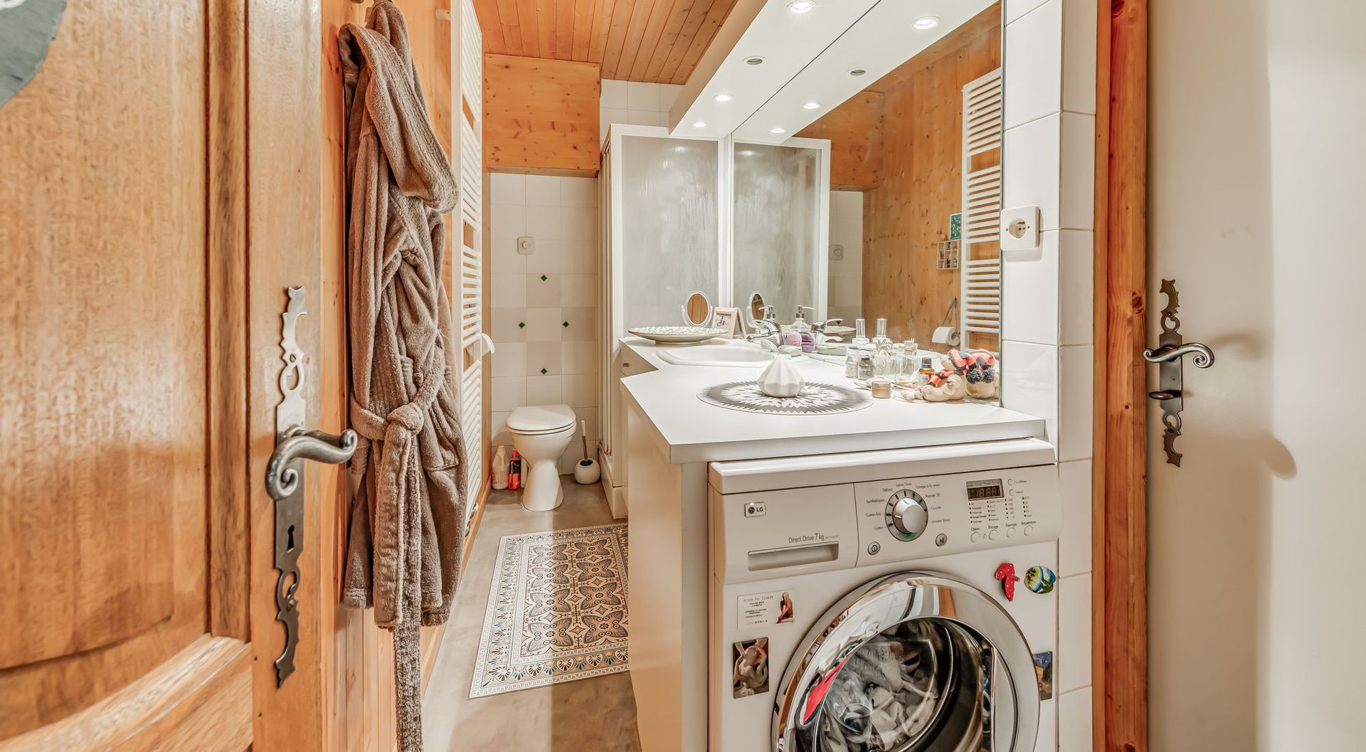 - 1 Salle de bains avec douche, meuble vasque, radiateur seche serviettes, WC et lave-linge