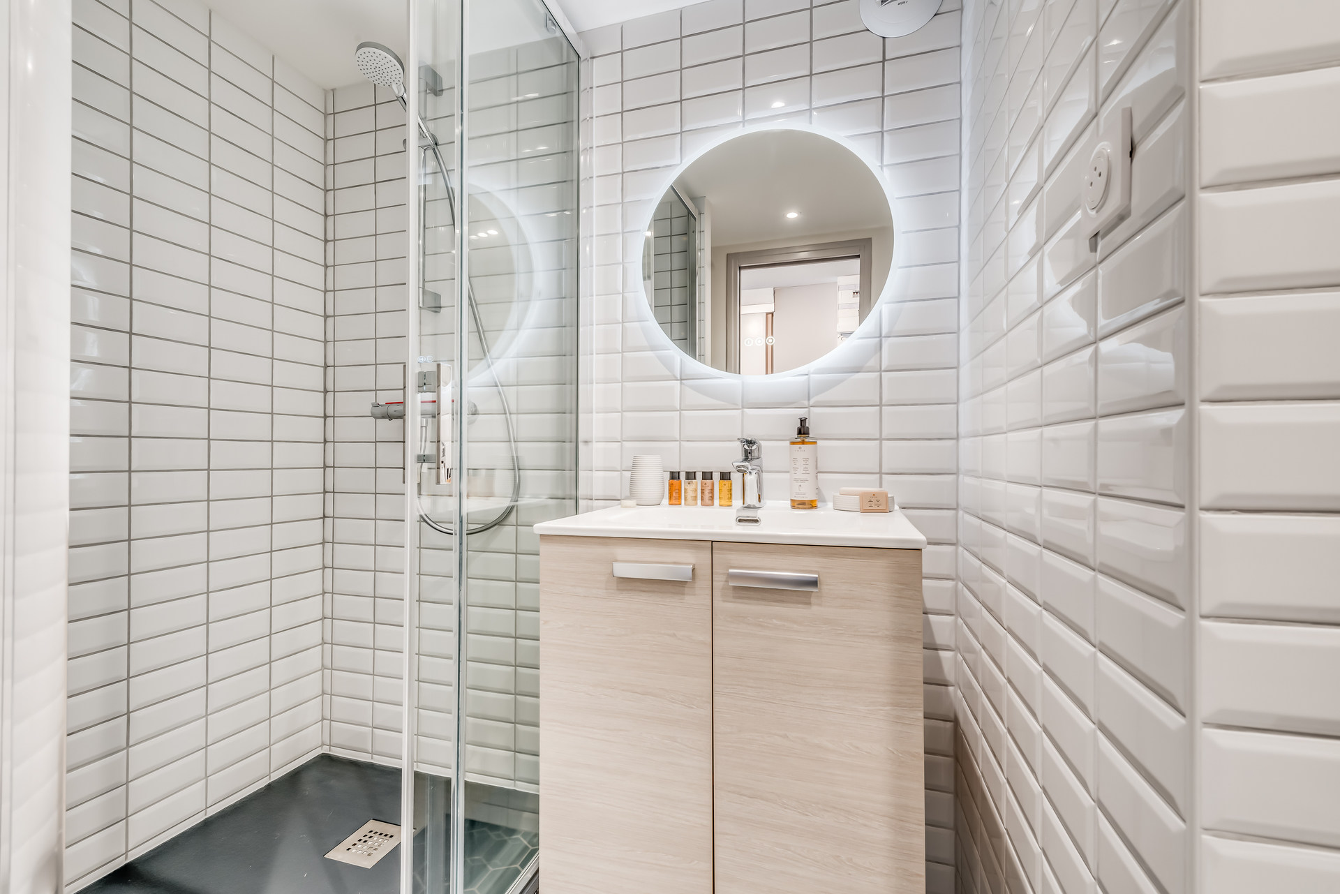 - Salle de bain avec douche, meuble vasque, lave-linge et WC
