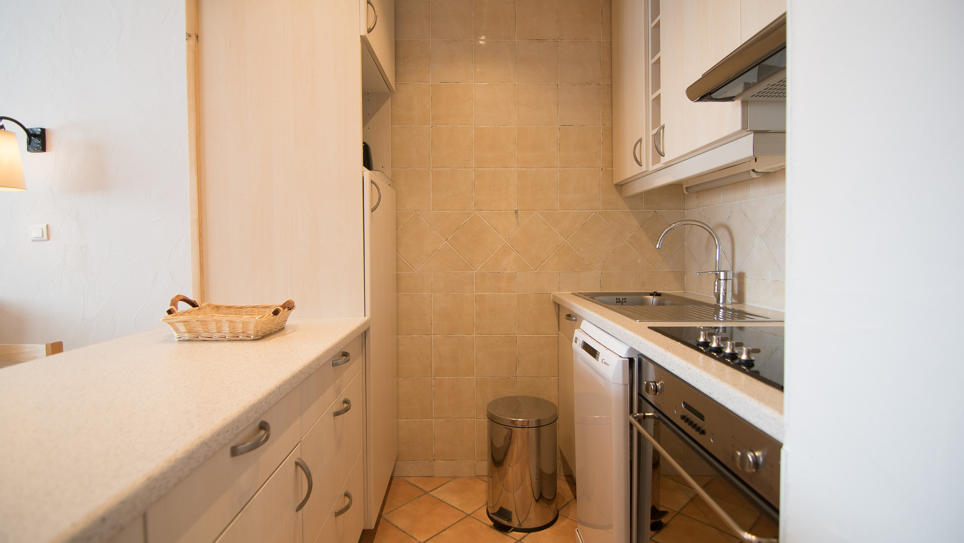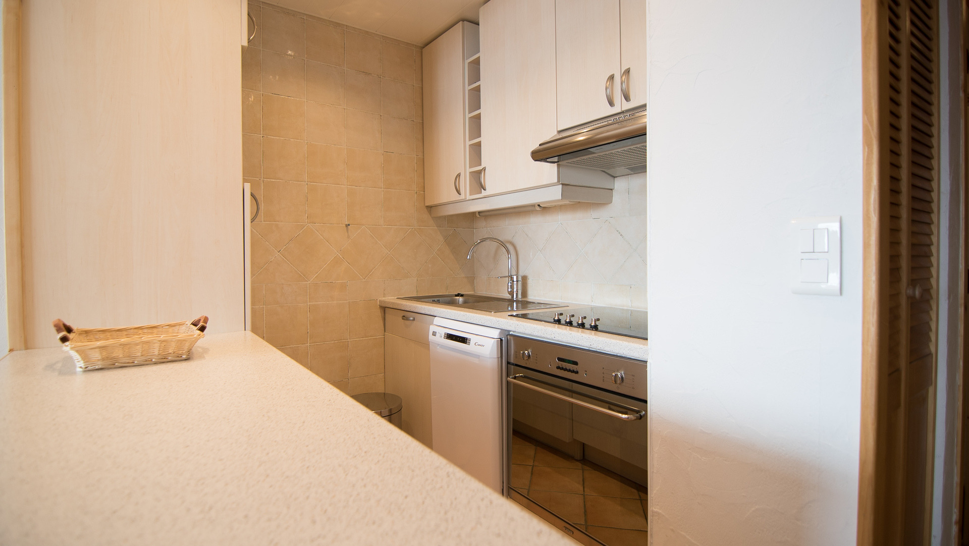 Cuisine : plaques vitocéramiques, four, réfrigérateur, lave-vaisselle et cafetière à filtre.