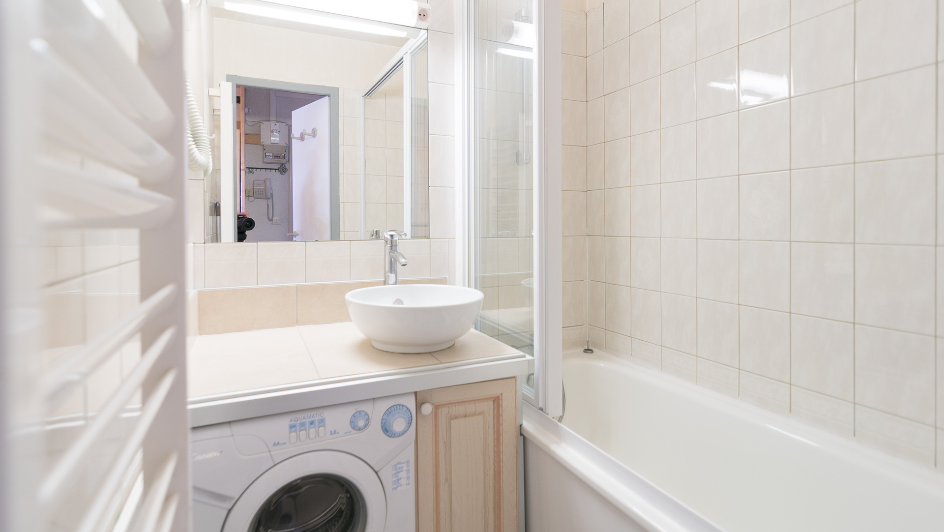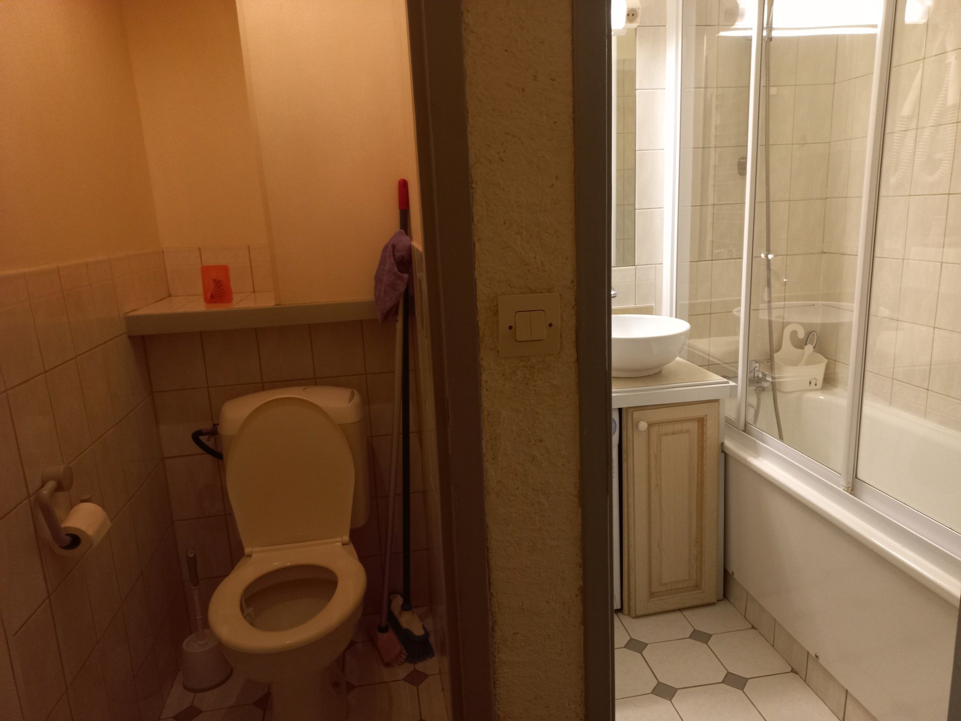 Sanitaires : salle de bains avec baignoire équipée d'un lave-linge, WC séparés.
