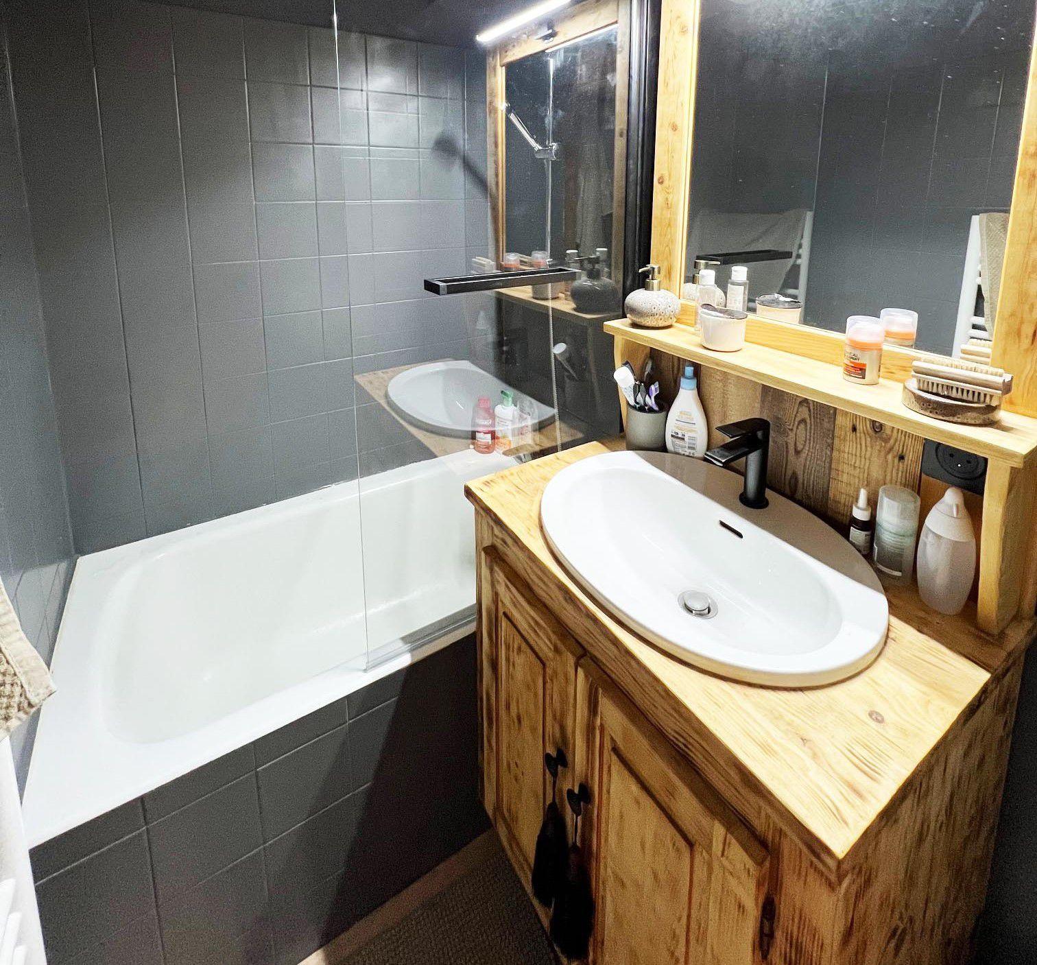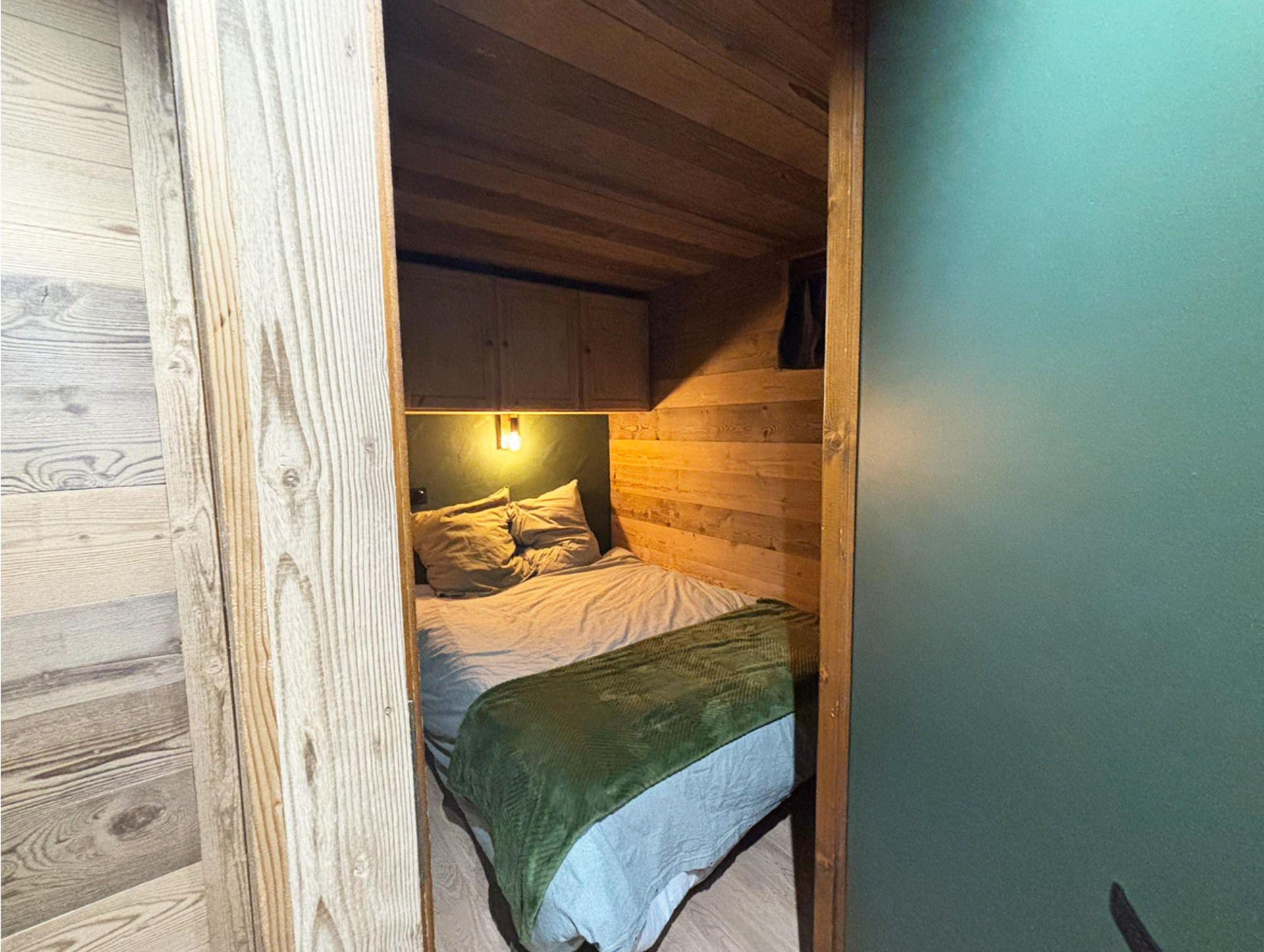 Entree/Hall : Placard - Chambre 1 : Lit, meuble pont, fenetre nord, vue coursive - WC - Salle de bains (2m2) : Baignoire, lavabo, radiateur seche-serviettes - Sejour : Coin salon : Canape, TV, table basse, baie vitree acces balcon sud, vue village - Coin repas : Table, banc et chaises - Coin cuisine equipee : Plaque electrique 3 feux, refrigerateur/freezer, lave-vaisselle, four, hotte, placards, appareil a raclette, cafetiere Nespresso