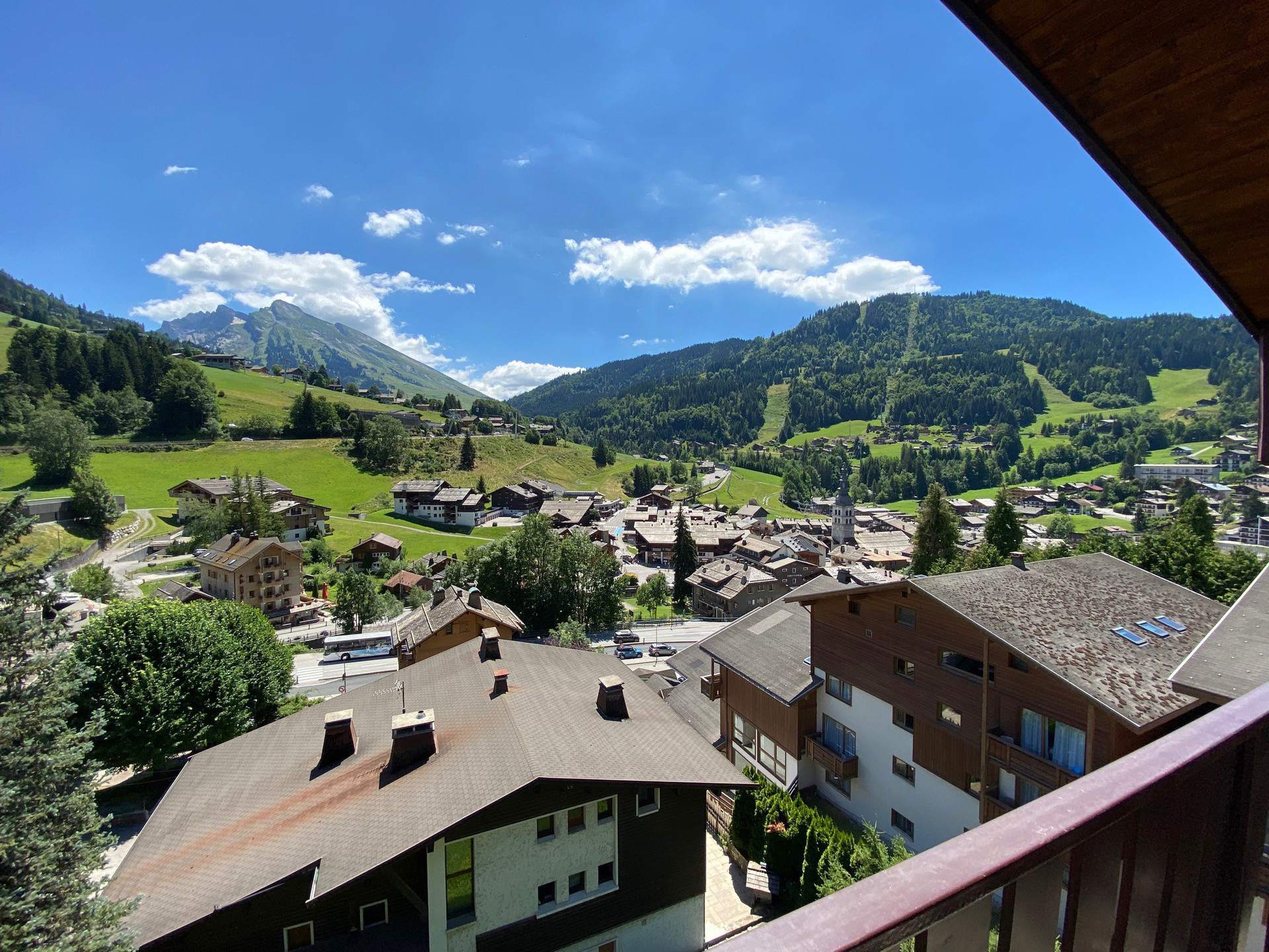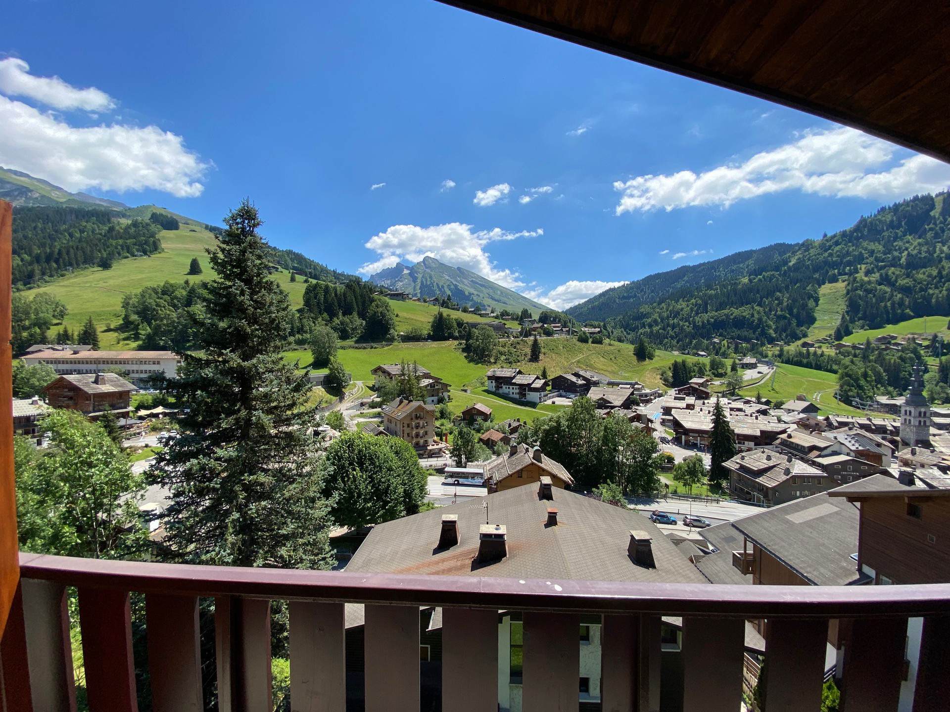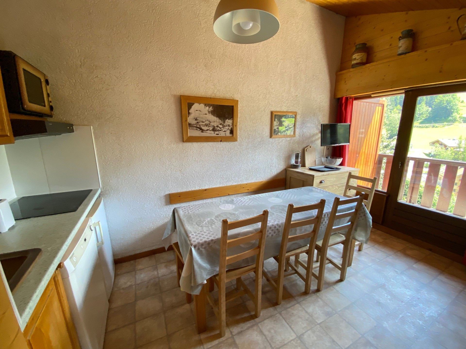 Entree/Hall : Placard - Chambre en partie mansardee (9,40 m2 dont 7 m2<1.80) : 2 lits, velux - Chambrette (4,70 m2) : 1 lit, fenetre sur coursive - Coin nuit (4 m2) en couloir : 2 lits - Salle d'Eau : Douche, lavabo - wc - Sejour (12 m2) avec Coin salon : Canape, television, table basse, baie vitree acces balcon sud vue village - Coin repas : Table et chaises - Coin cuisine equipee : Plaque electrique 4 feux, refrigerateur, lave-vaisselle, placards.
