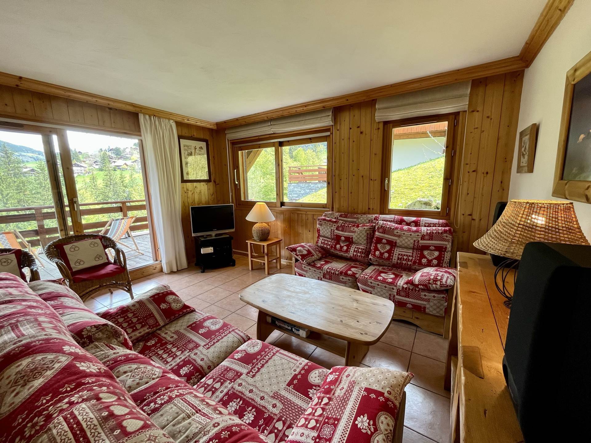 Entree/Hall : Placard penderie - Chambre 1 (6 m2) : 1 lit, fenetre est vue village, placards - Salle de bains : Baignoire, lavabo, fenetre - wc - Chambre 2 (7 m2) : 1 lit, placard, fenetres est et nord, vue village - Sejour (25 m2) avec Coin salon : Canape, television, table basse, baie vitree acces terrasse - Coin repas : Table et chaises - Cuisine equipee : 4 plaques vitroceramiques, four, lave-vaisselle, hotte, refrigerateur (205L), placards -