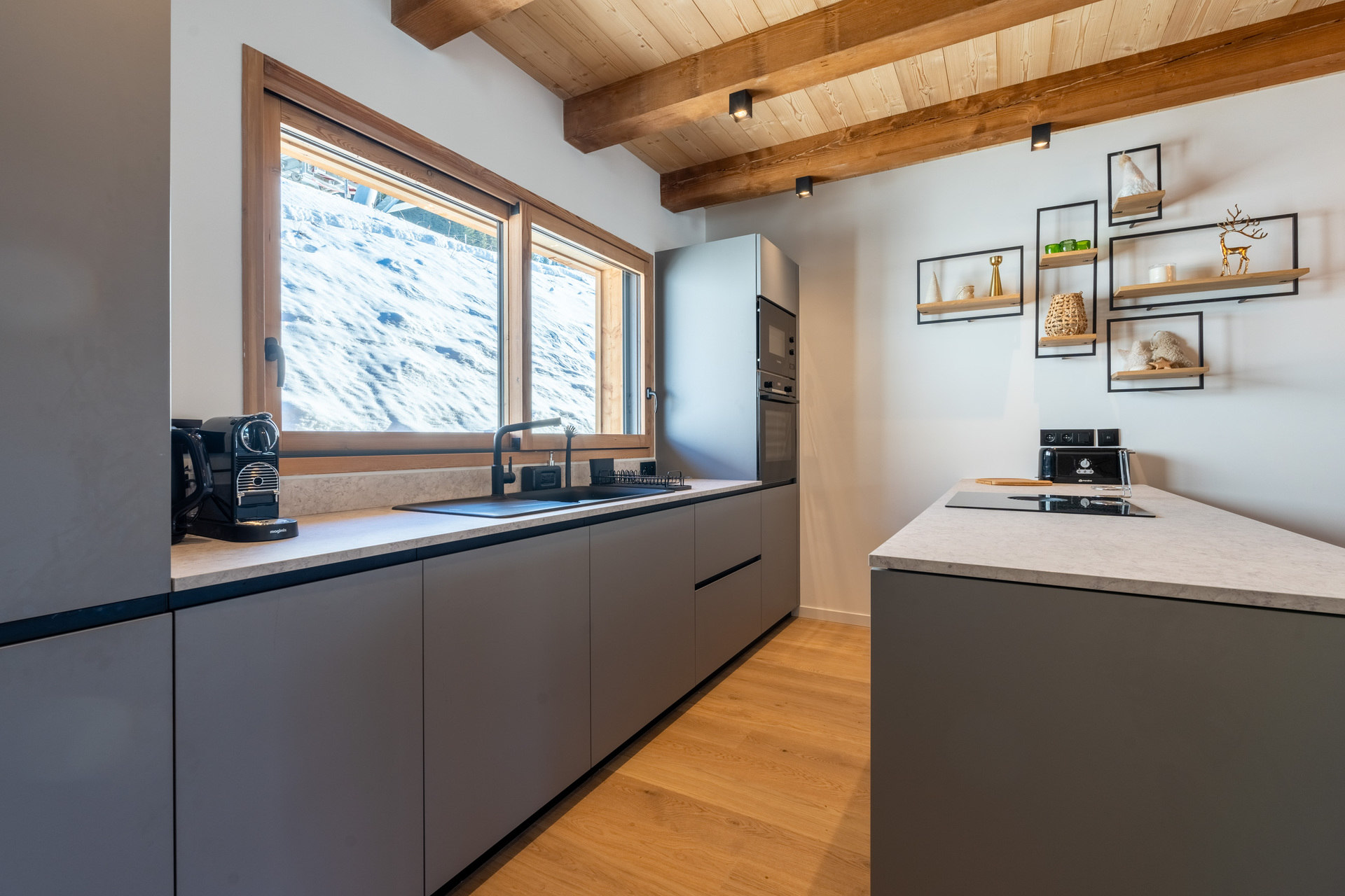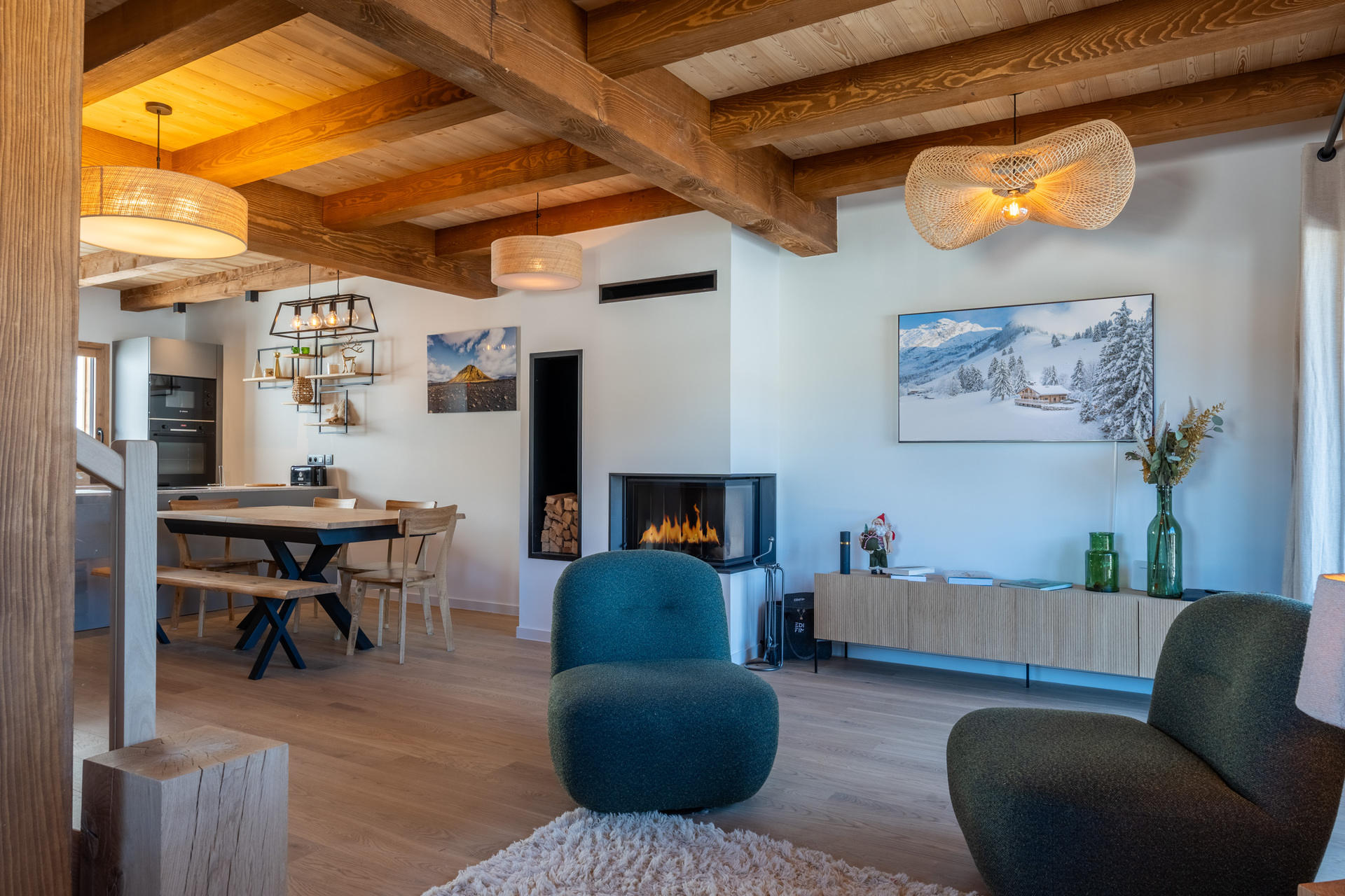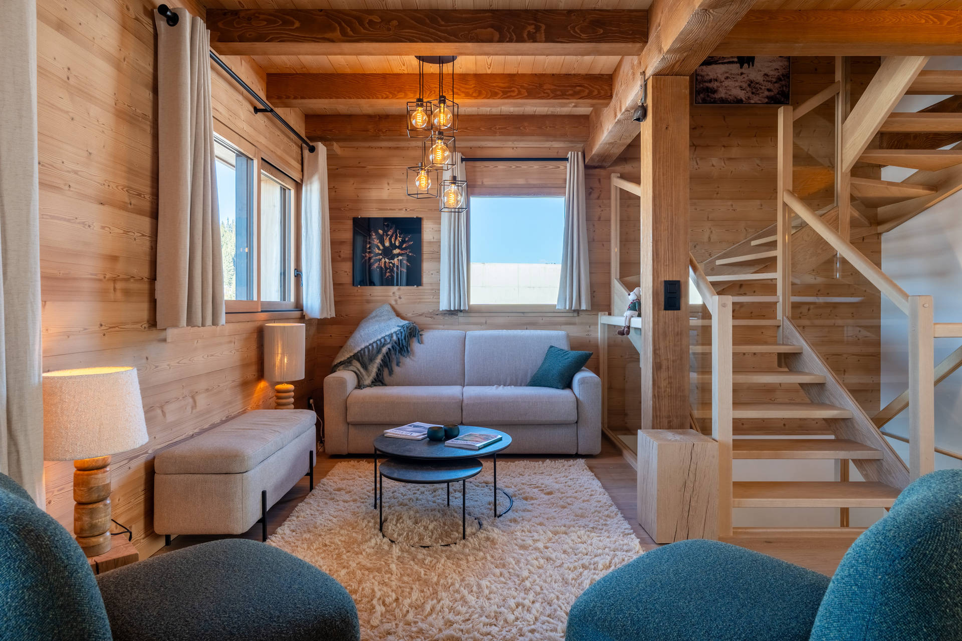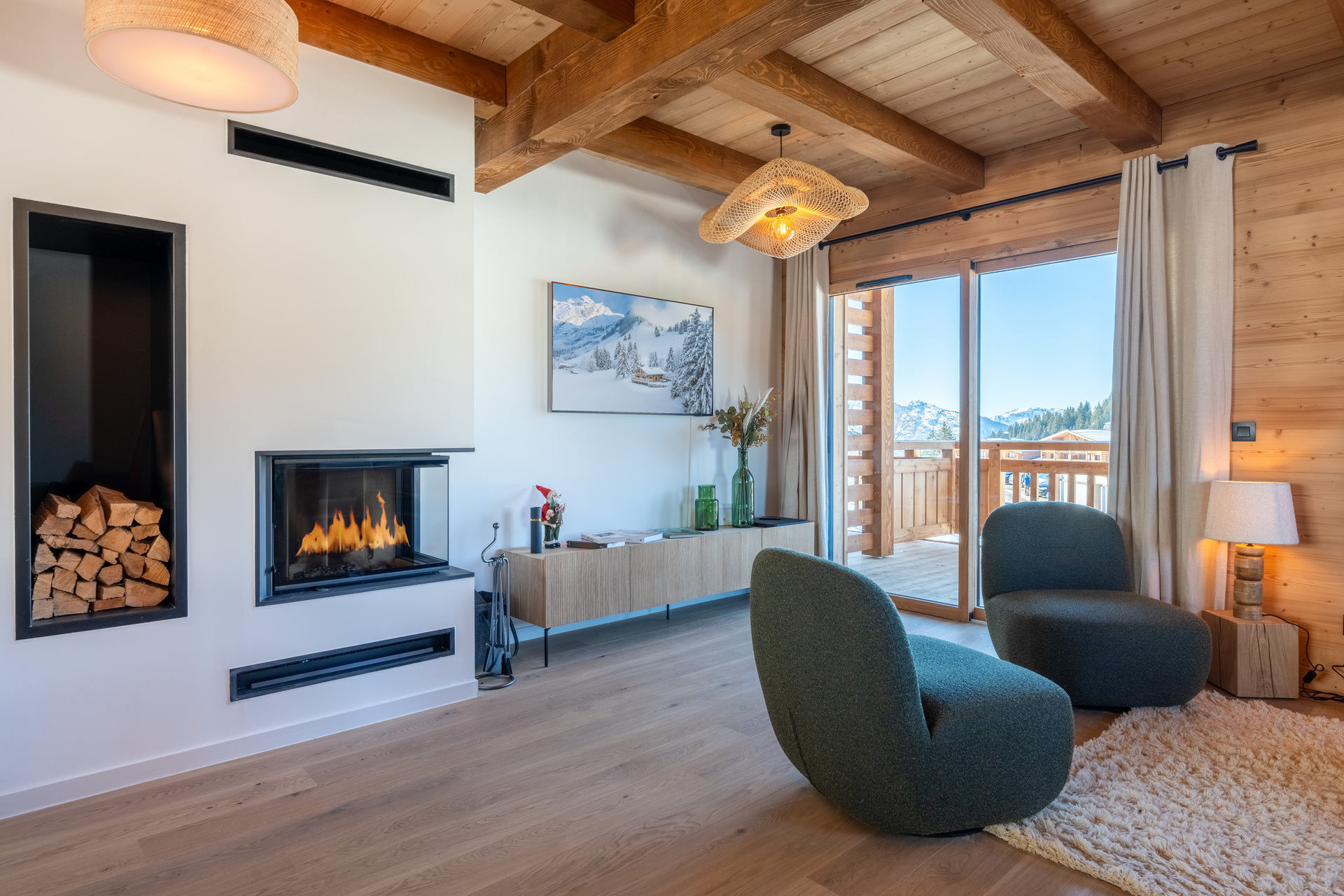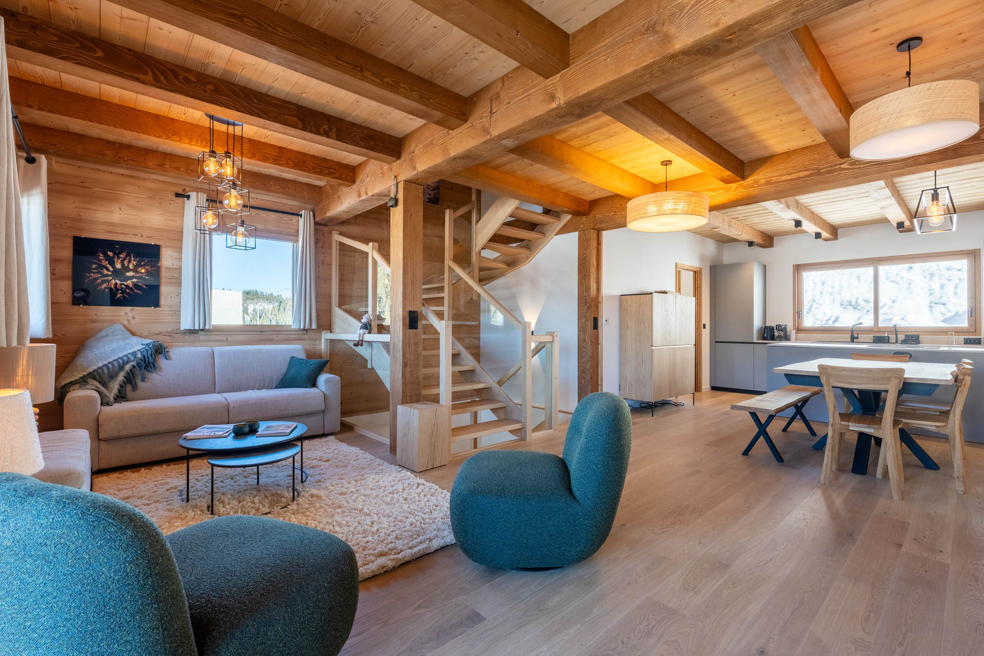 Au RDC : grand sejour (30.97 m2) tres lumineux avec table 7 a 10 personnes, vue sur massif de Beauregard, salon avec cheminee, Smart TV, canape-lit pour 2 personnes, cuisine equipee ouverte sur sejour (10.37 m2) : refrigerateur, four, micro-onde, plaques de cuisson a induction, lave-vaisselle, bouilloire, cafetiere Nespresso et Bodum, grille-pain, appareil a raclette et fondue, balcon Ouest avec mobilier de jardin - Petite chambre "coin montagne" (6 m2) avec lits superposes 80 x 190cm, WC - Terrasse (28 m2) accessible depuis le sejour avec mobilier de jardin.