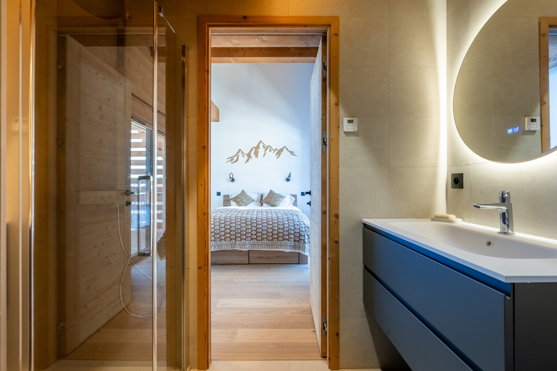 Au premier etage : Chambre 1 (12.31 m2) avec lit 160 x 200 cm, salle d'eau attenante (3.68 m2 dont 1 m2 <1.80m): douche, lavabo, miroir, radiateur seche-serviettes, WC, lave-linge, acces balcon - Chambre 2 (11.73 m2) avec lit 160 x 200 cm, acces balcon - Chambre 3 (8.55 m2) avec lit 160 x 200 cm, acces balcon - Salle de bain (4.26 m2): baignoire, double vasque, miroir, radiateur seche-serviettes - WC (1.34 m2). Service para-hotellerie : menage de fin de sejour inclus (hors poubelles et vaisselle), linge fourni, lits faits a l'arrivee. Chauffage au sol - Couettes - Animaux non autorises - Logement non-fumeur - Seche-cheveux - Wifi - Classement en cours: **** pour 6 personnes, maximum 10 personnes - Non accessible et adapte aux personnes a mobilite reduite (marches pour acceder au chalet et escaliers interieurs). Possibilite de reserver le demi-chalet 3B en complement pour un total de 16 personnes).