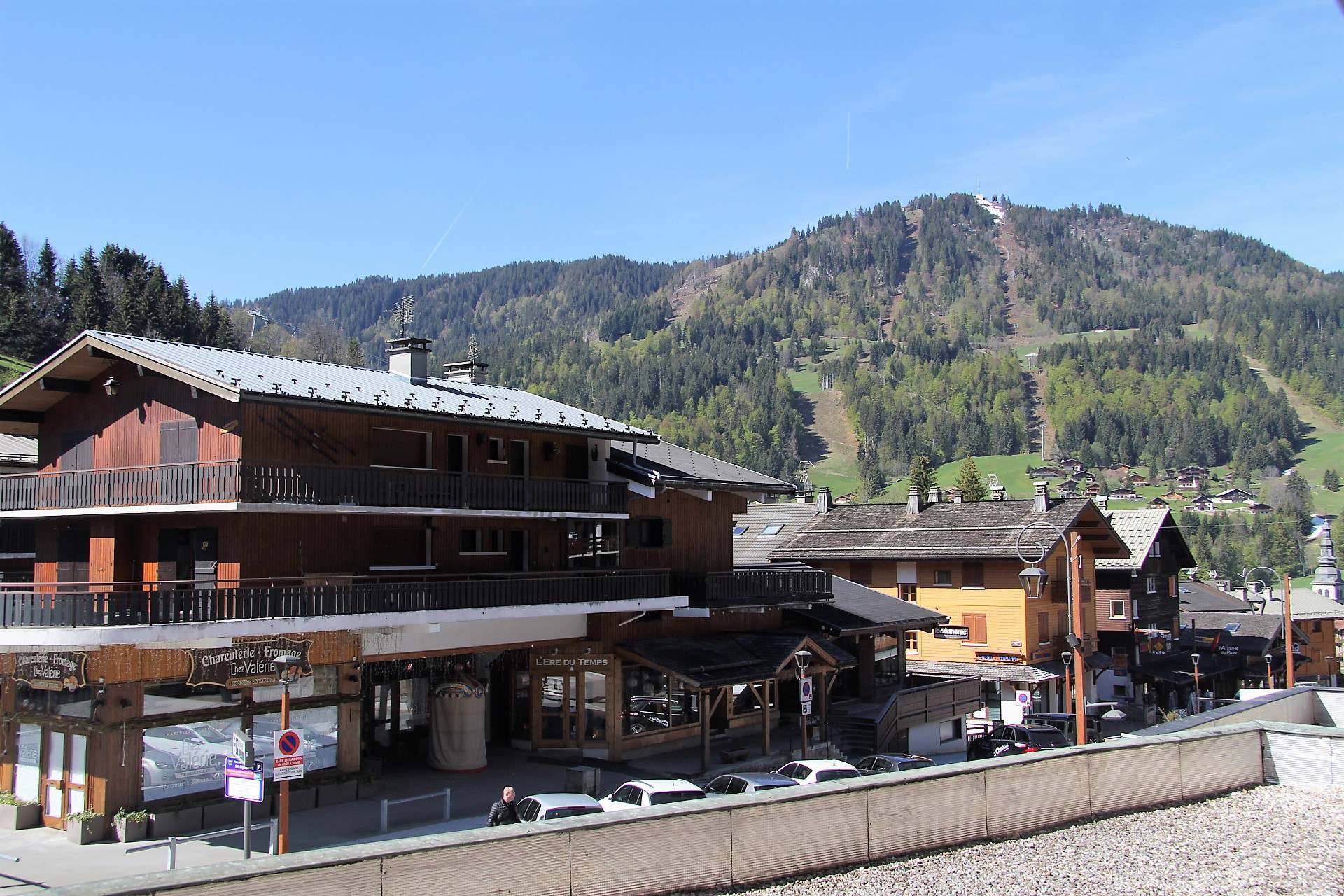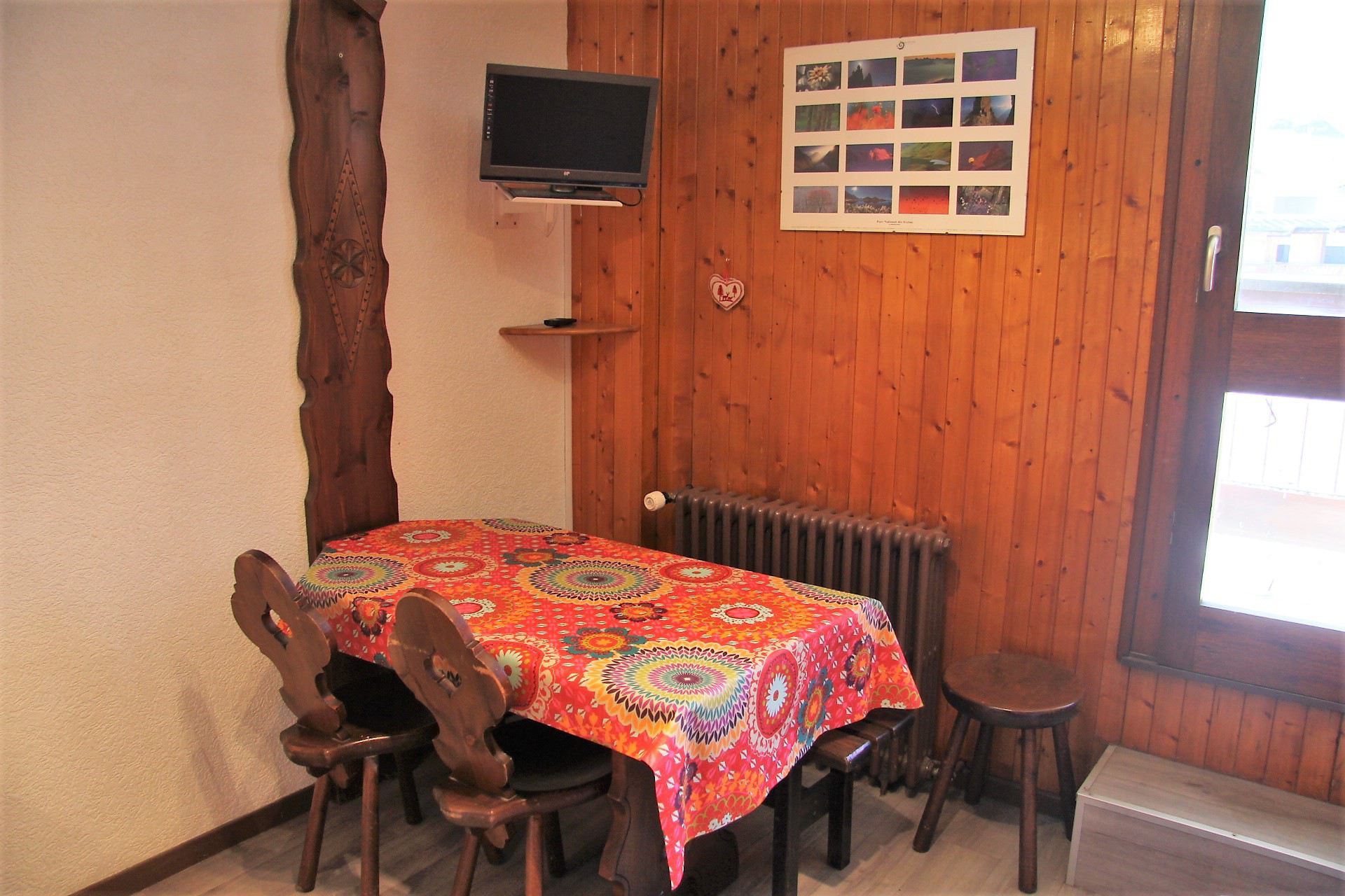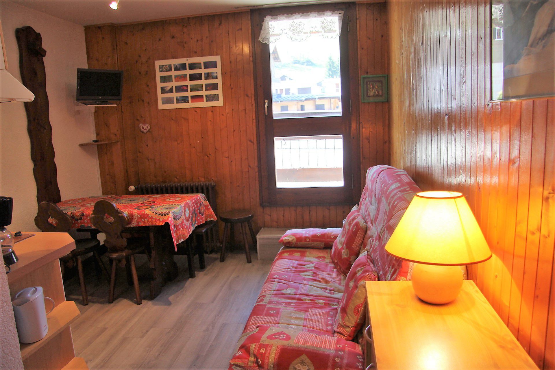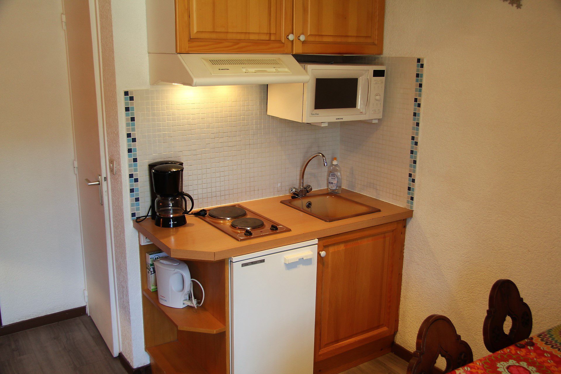 Entrée : placard - Salle d'eau : Douche, lavabo, wc - Séjour (10 m²) avec Coin salon : Canapé, télévision, baie vitrée accès balcon sud vue village - Coin repas : Table et chaises - Coin cuisine: 2 plaques électriques, four, réfrigérateur (90L), placards.