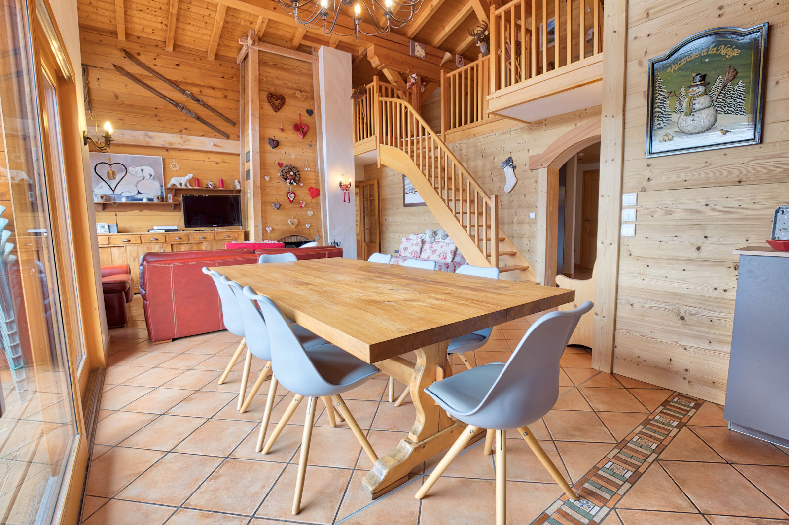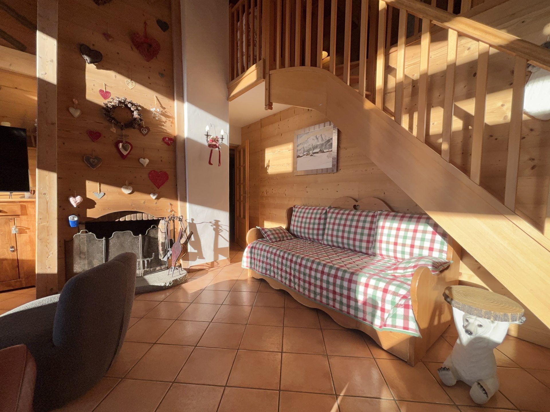 - un grand sejour cathedrale avec salon / salle a manger : canapes, cheminee, television ecran plat avec Canal+ et lecteur DVD (salon avec un canape-lit gigogne 2*90 cm)