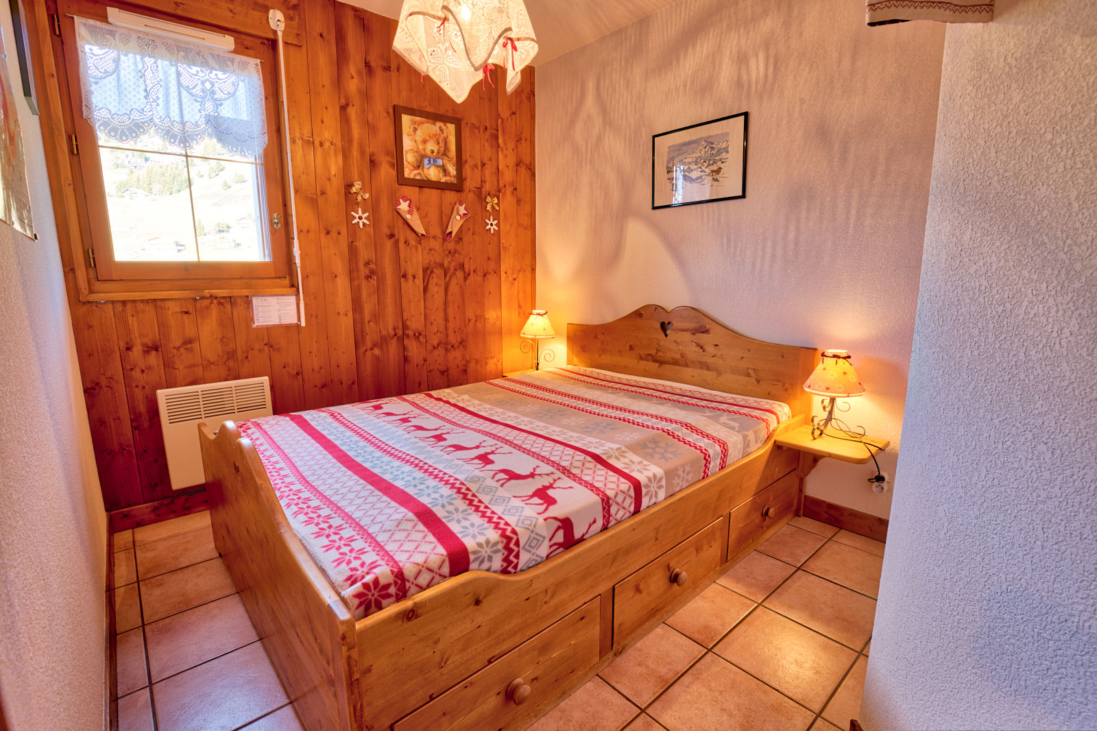 - Couchages : une chambre avec un lit double (140), une chambre avec lits superposes une personne et un lit tiroir (3x90). Literie equipee de couettes et couvertures.