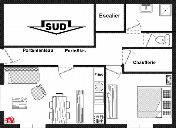 NOTRE AVIS : Grande pièce à vivre. Décoration sympa. Emplacement idéal. En été, vous pourrez profiter d'un salon de jardin pour vos déjeuners en extérieur. Meublé classé 2**.