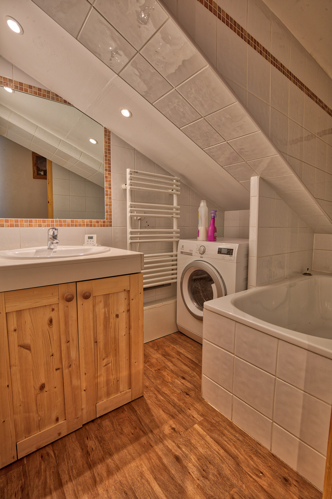 - Deux salles de bains : une avec douche et une avec baignoire et lave linge sechant.