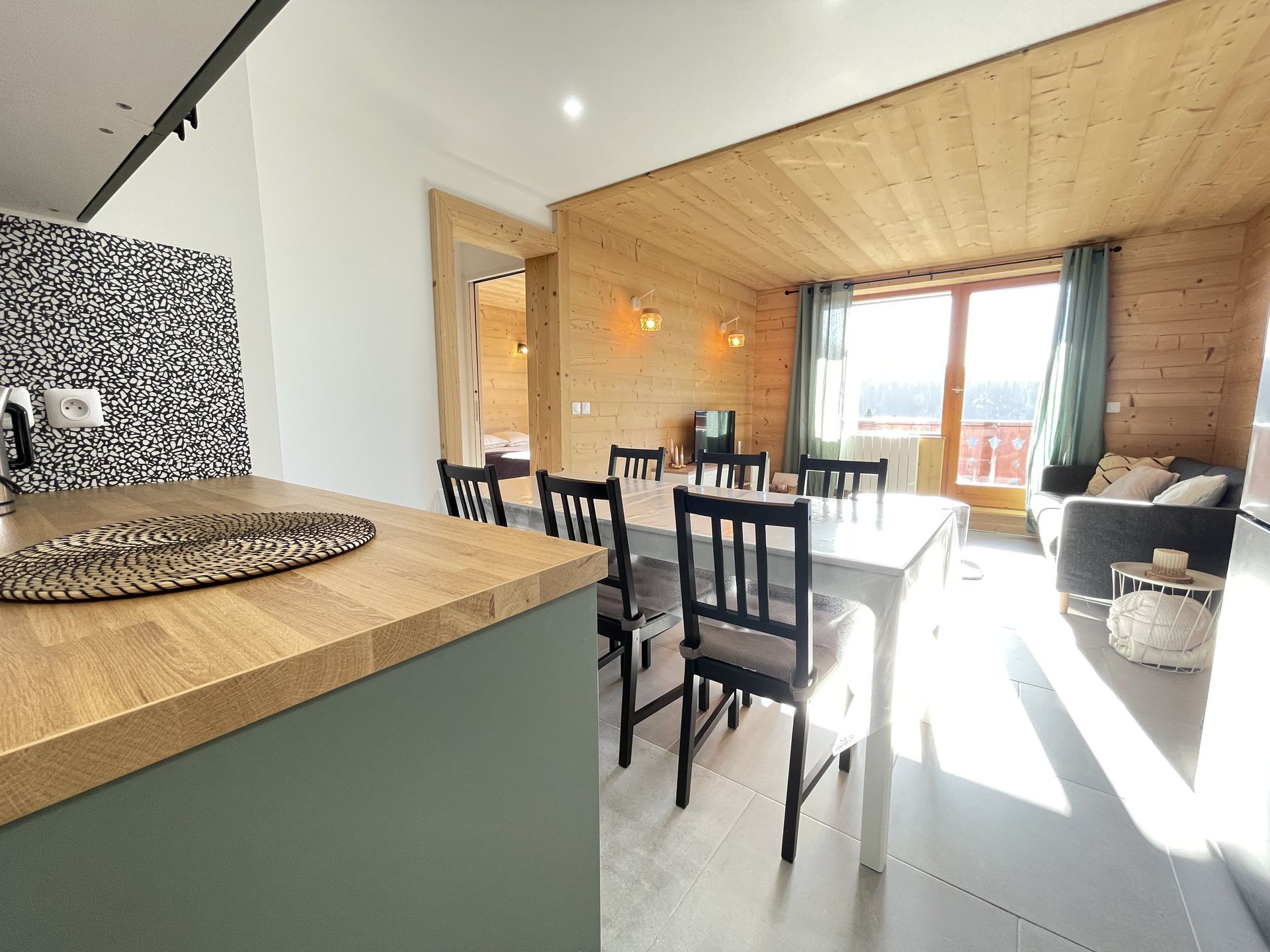 Appartement moderne, entierement renove de trois pieces, d'environ 44 m2 pour un maximum de 6 couchages. Il benefice d'un balcon expose SUD offrant une belle vue sur le Mont Charvin et la vallee. Vous apprecierez les rayons du soleil tout au long de la journee.