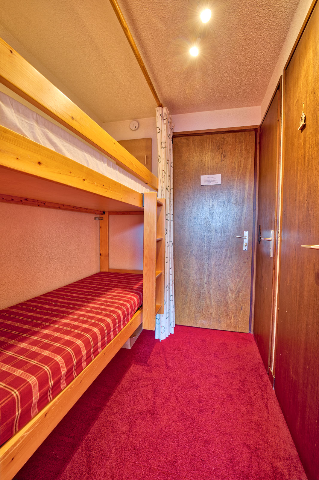 - Couchages : coin montagne avec deux lits superposes une place (2x90), sejour avec un canape lit deux places (Rapido -140). Literie equipee de couettes.