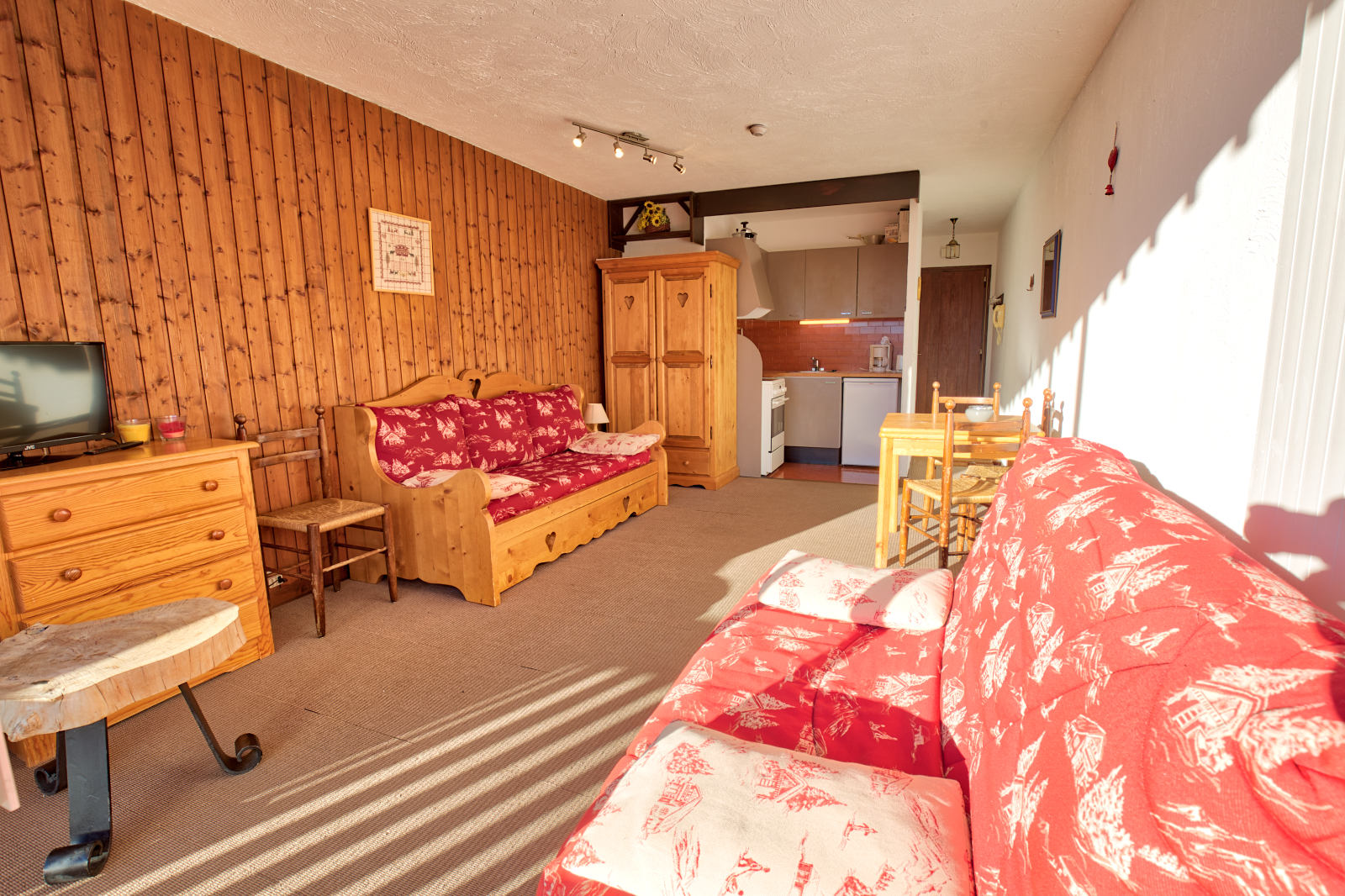 NOTRE AVIS : Studio très lumineux, avec une grande baie vitrée. Belle décoration de style montagne.