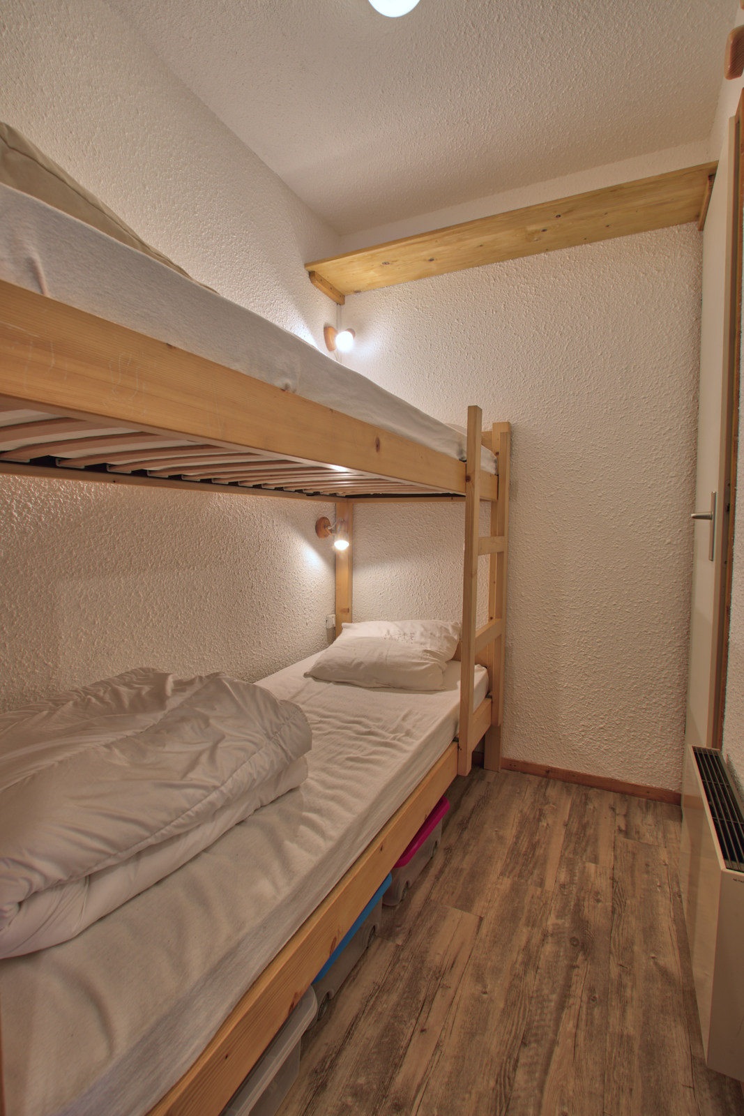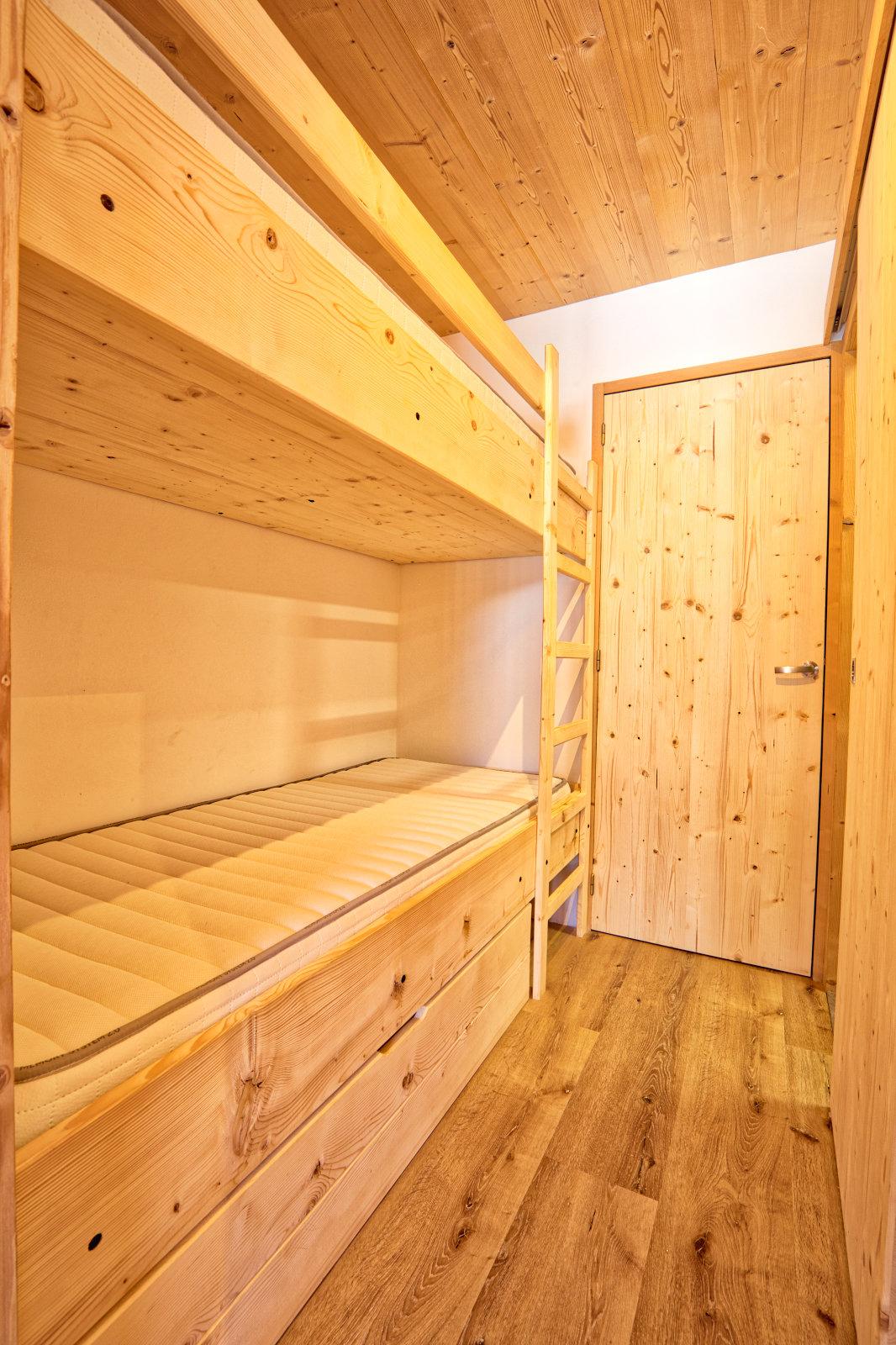 - Couchages : une chambre cabine avec lits superposes (2x90), sejour avec un canape-lit deux personnes (140). Literie equipee de couettes.