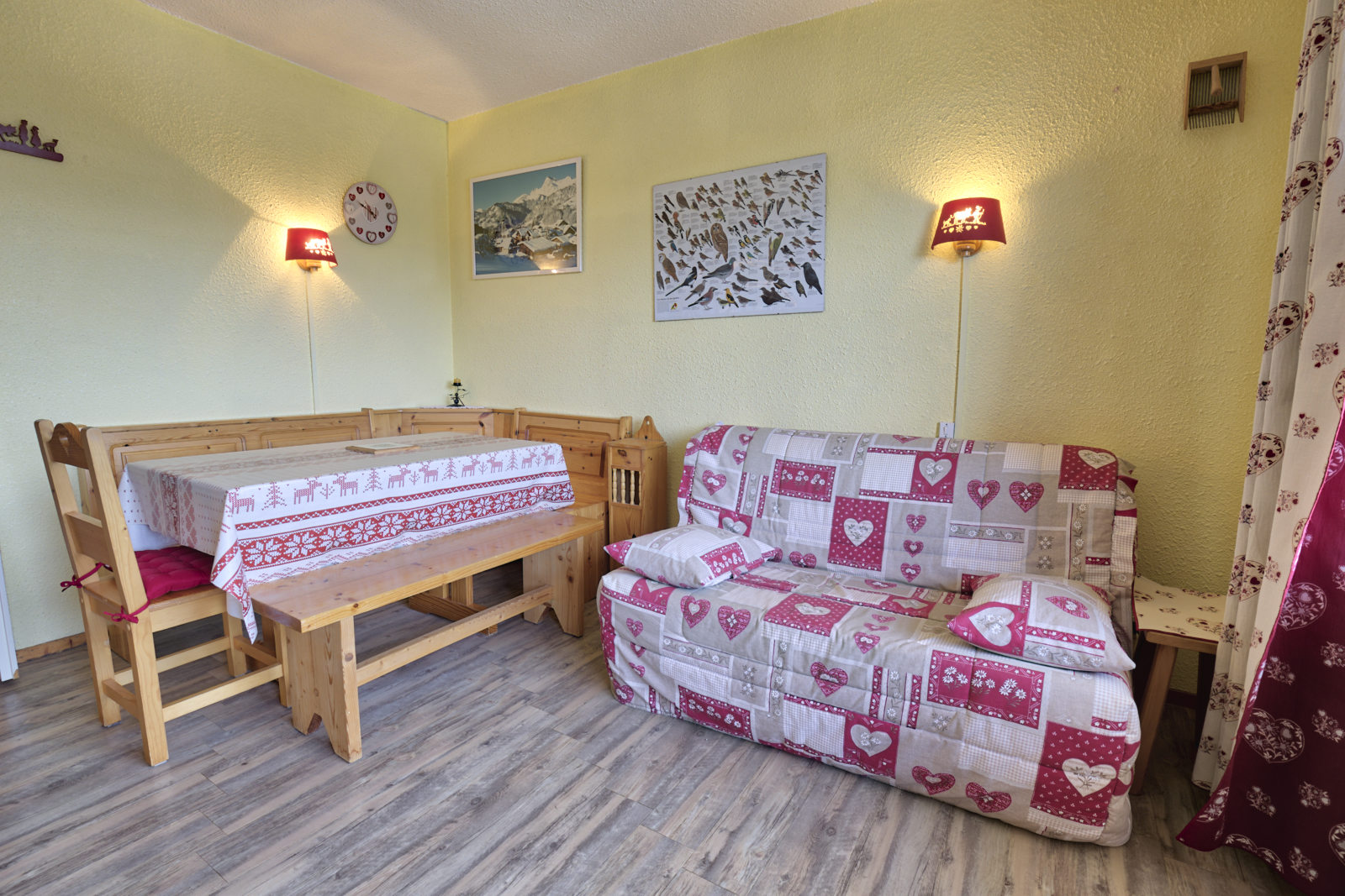 NOTRE AVIS : Decoration montagne tres sympa. Piece a vivre tres lumineuse. Exposition plein SUD, soleil toute la journee.