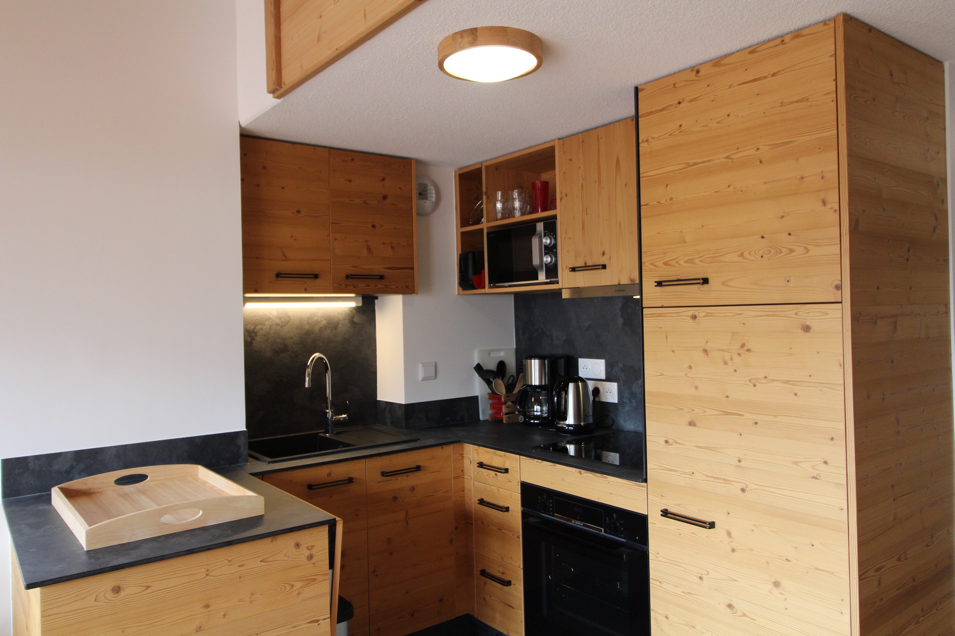 Sejour avec cuisine equipee : four, micro-onde/grill, refrigerateur, plaques induction, lave vaisselle, cafetiere electrique, television.