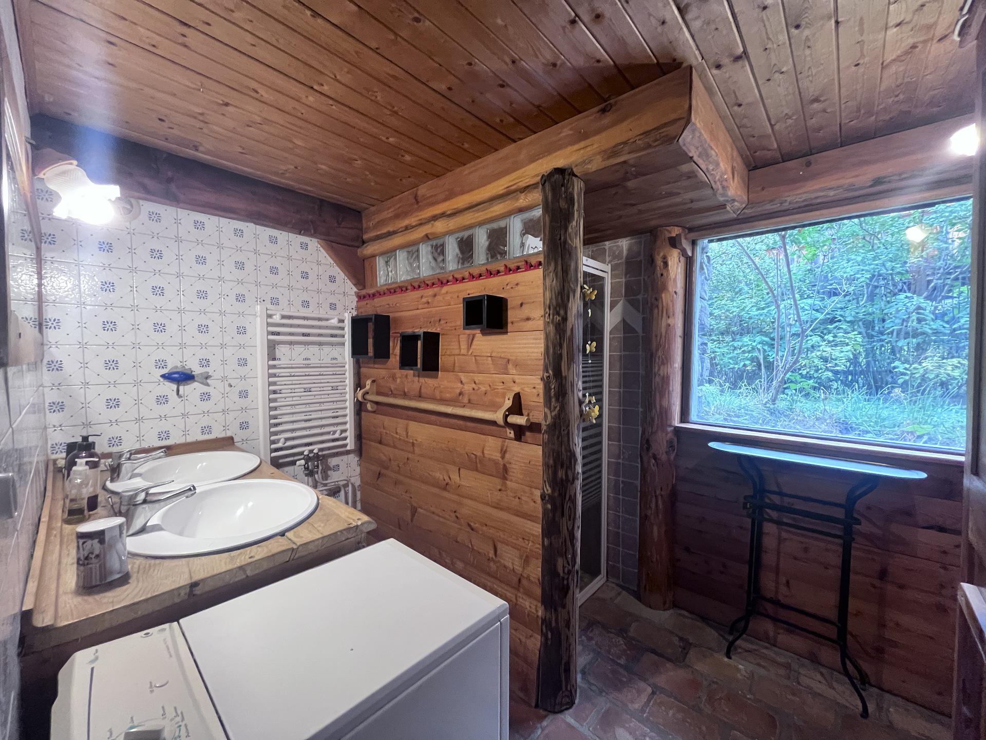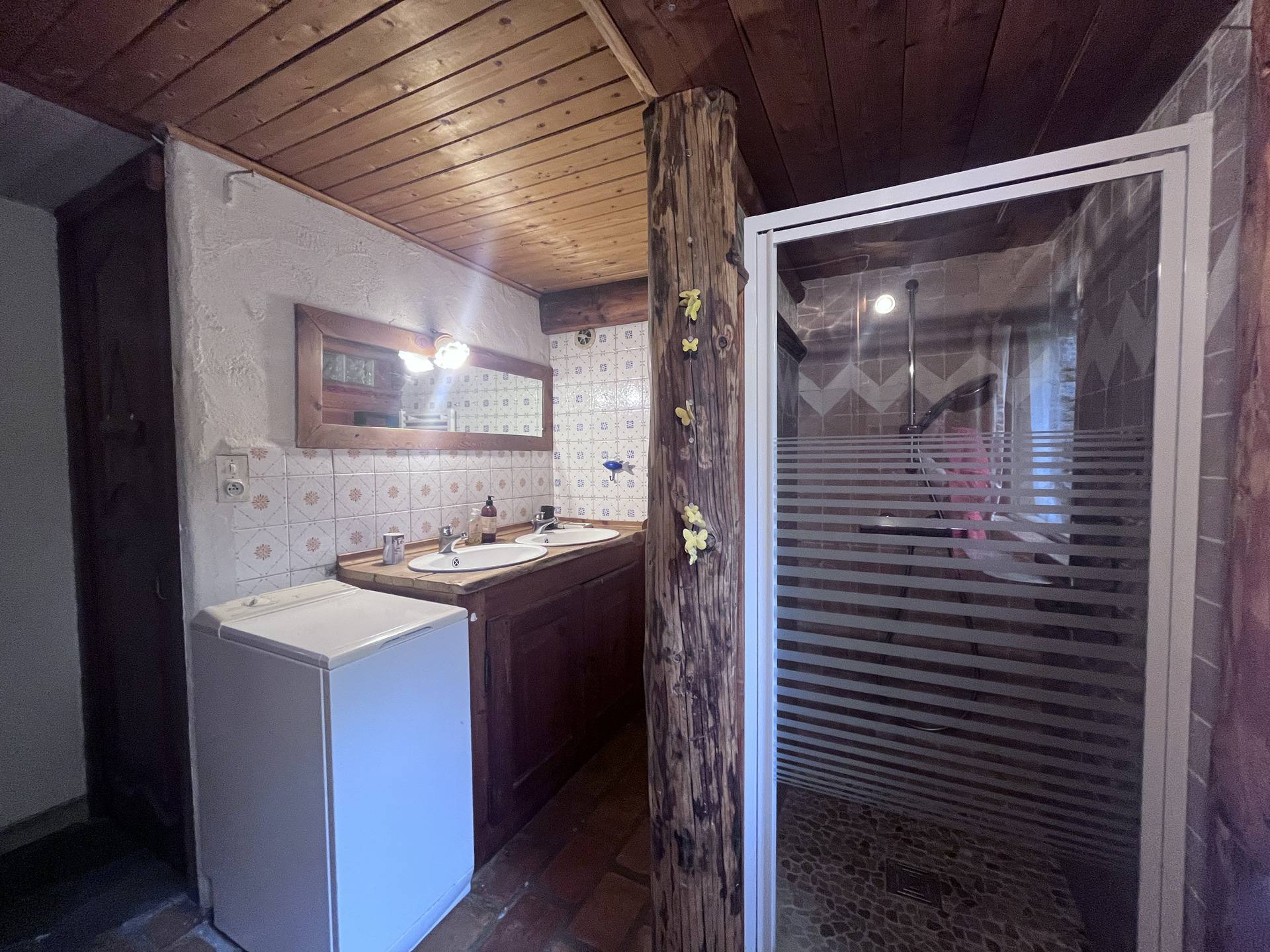 Salle de bain (sans porte) : douche, lavabo. WC separes.