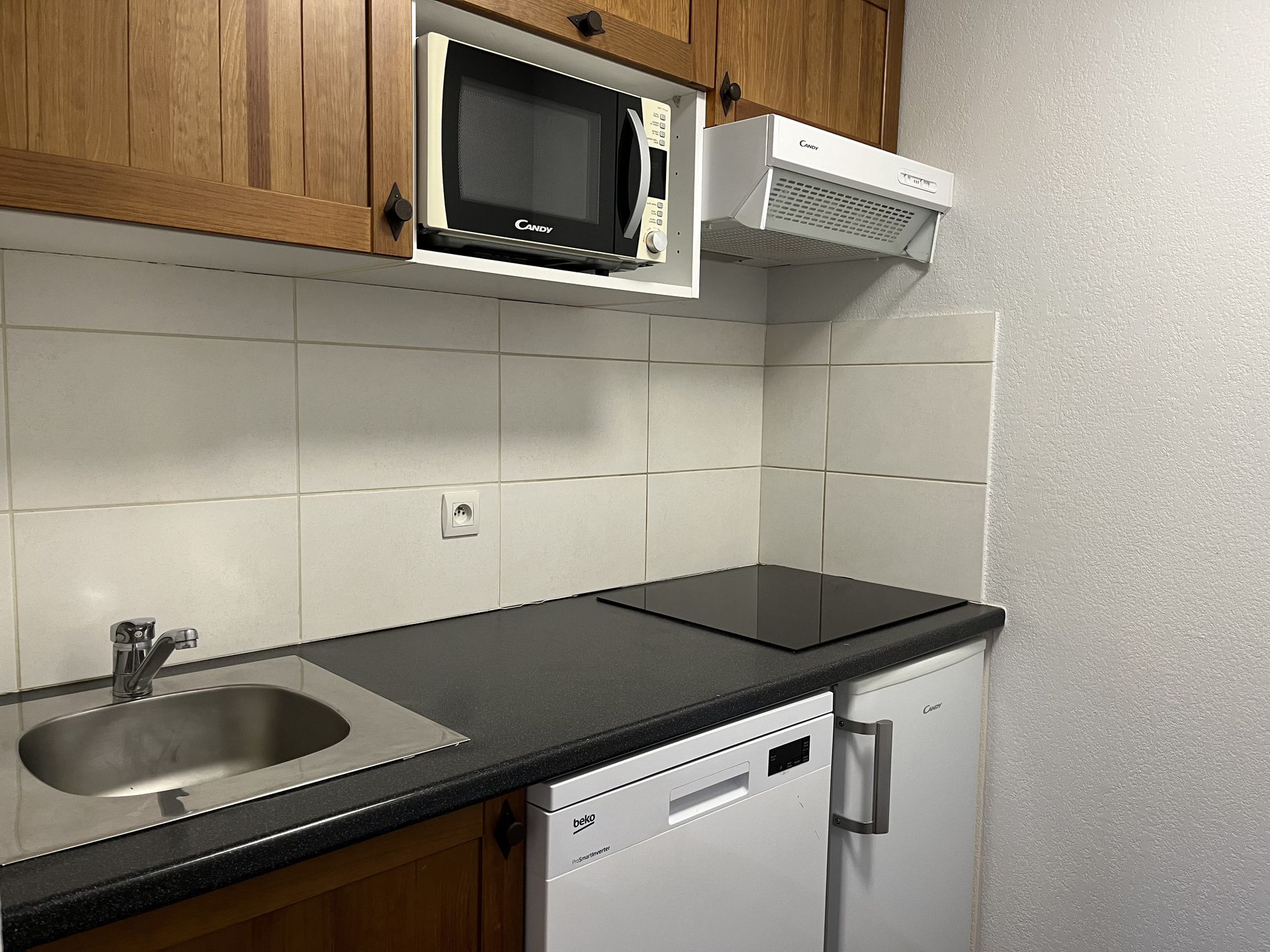 Coin cuisine equipee d'une plaque vitroceramique, micro-ondes, lave-vaisselle et refrigerateur.