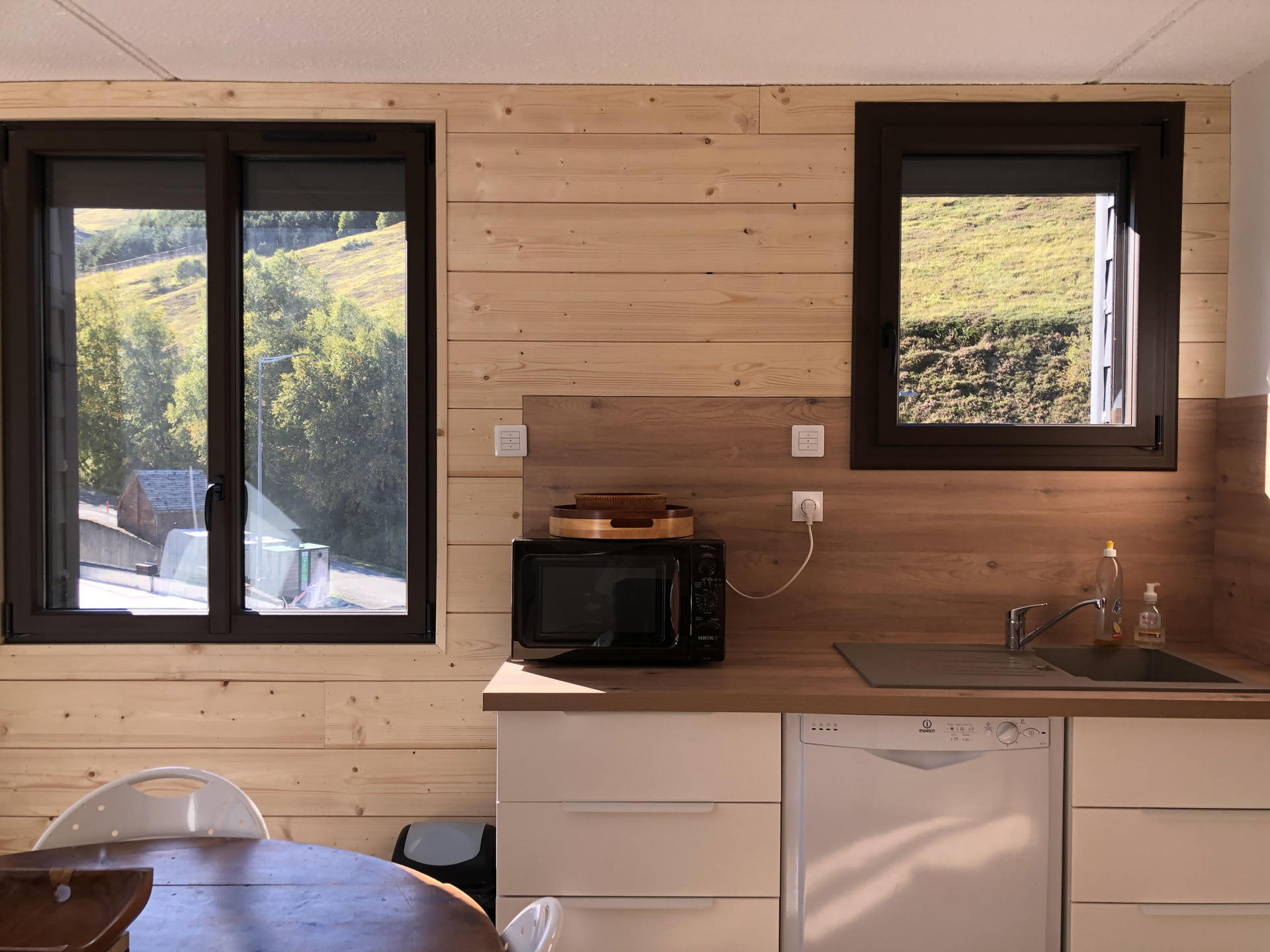 Cuisine ouverte sur le sejour,  equipee de 3 plaques induction, mini-four, micro ondes, refrigerateur, lave-vaisselle