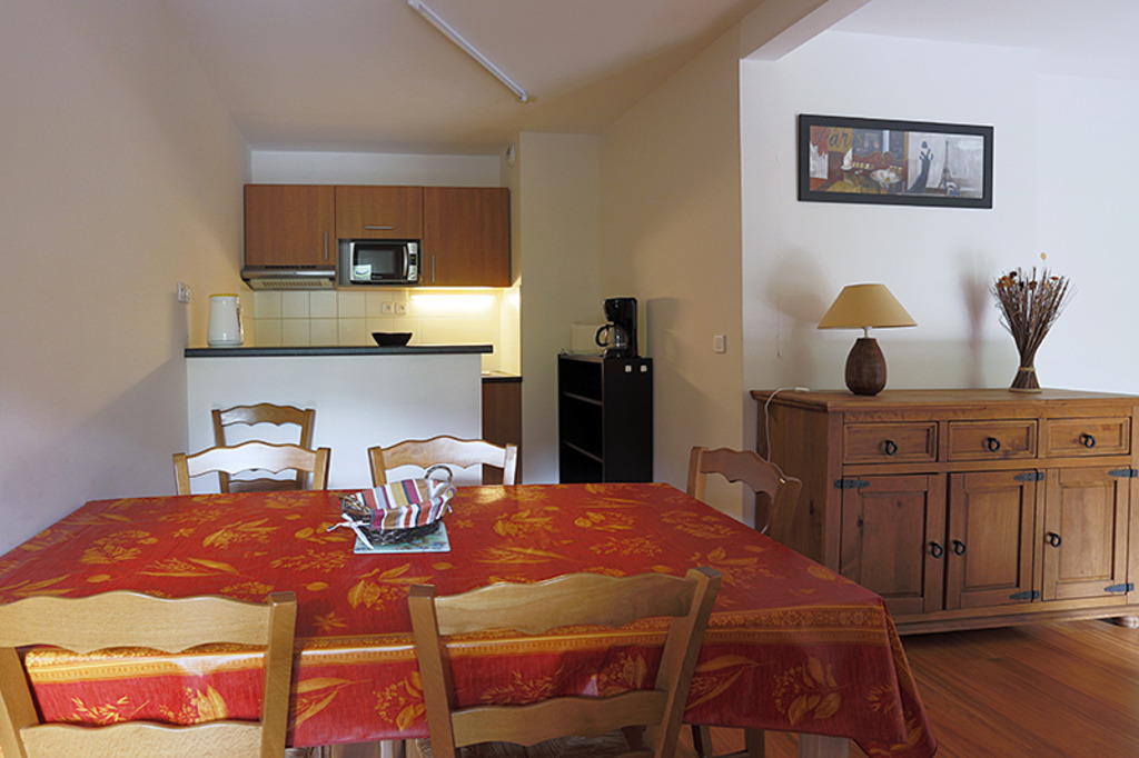 Kitchenette équipée de 4 plaques induction, d'un four, d'un micro ondes, d'un réfrigérateur et d'un lave vaisselle.