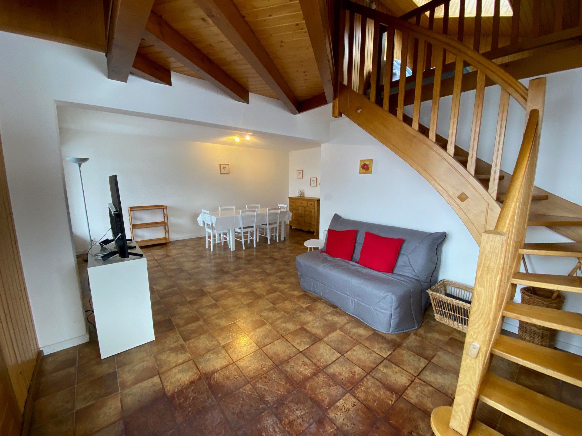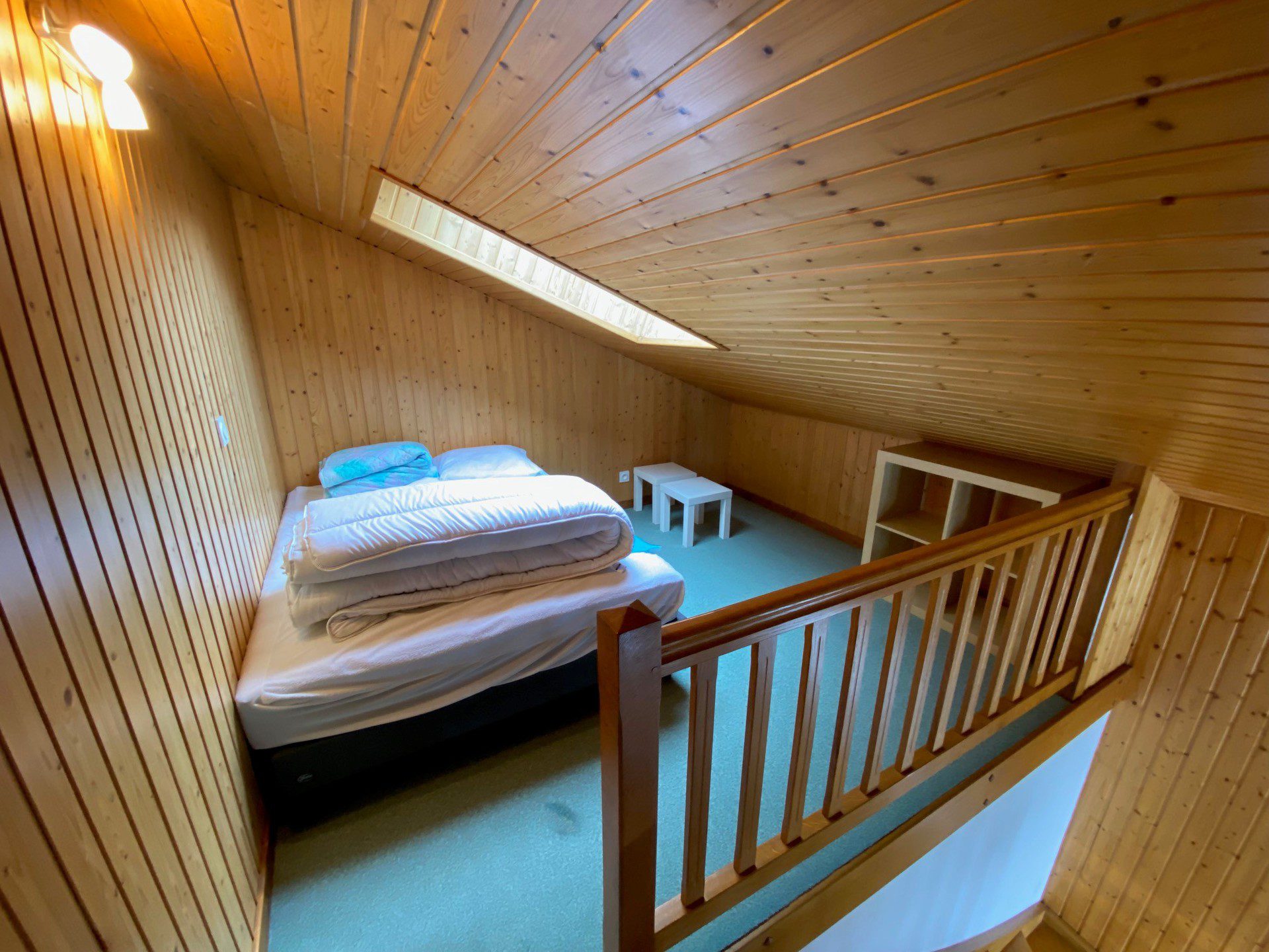 Etage superieur : - Mezzanine mansardee ouverte sur sejour (11.80m2 dont 8.49m2 <1.80) avec 1 lit (140x190) pour 2 personnes, velux