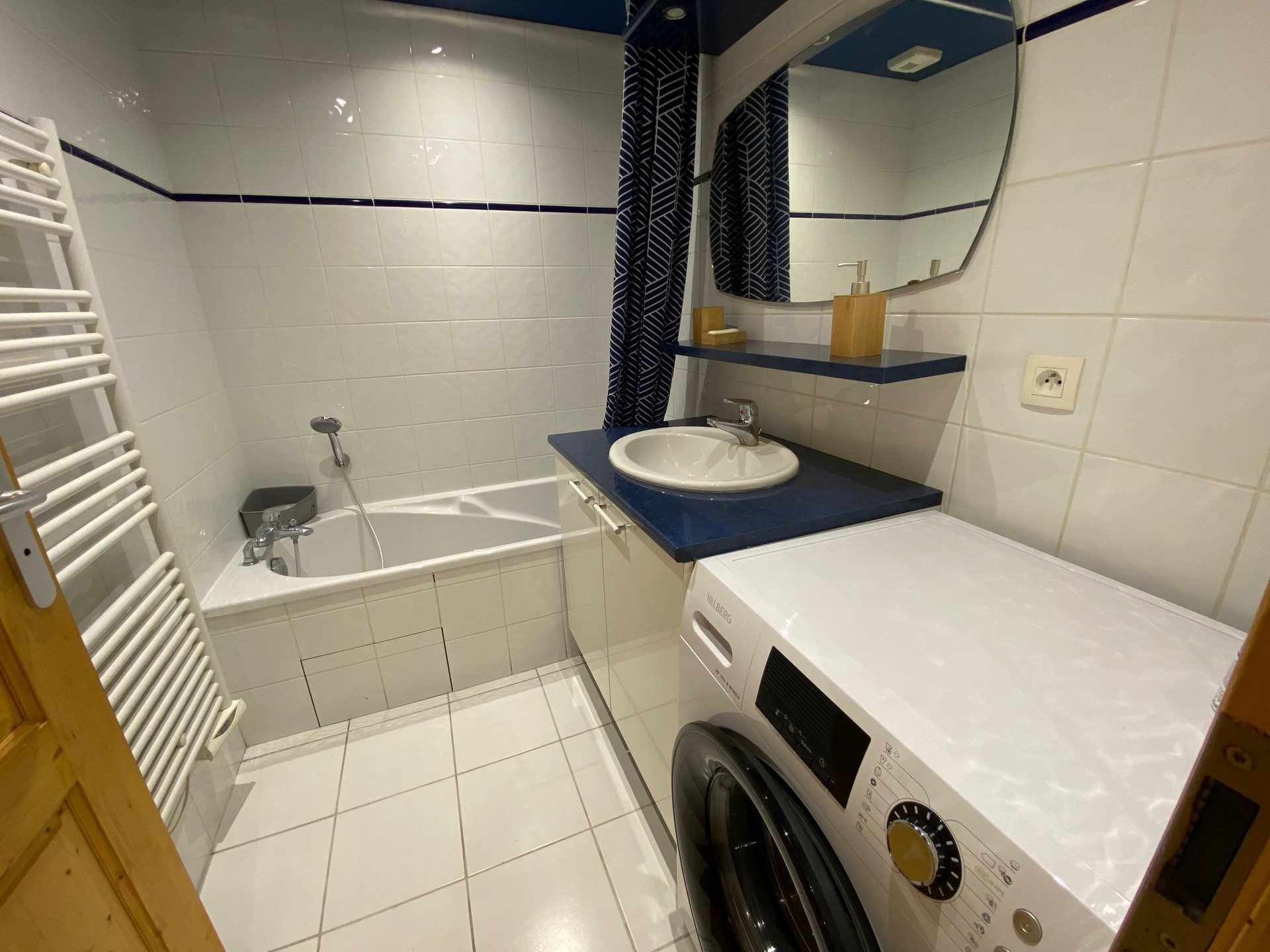 Entree / hall placard penderie - Salle de bains (3.64m2) : baignoire, lavabo vasque, radiateur seche serviettes, lave-linge - WC separe - Chambre 1 (11.74m2) : lit, rangement, fenetre sud vue mmontagne - Cabine (6.20m2) : lits, rangement, fenetre de lumiere sur coursive - Sejour (24 m2) : Canape convertible type rapido, fauteuils, coin TV, acces balcon - Kitchenette equipee : Lave-vaisselle, refrigerateur congelateur, hotte, plaque induction 4 feux, four, micro-ondes, plan de travail, elements de rangement hauts et bas