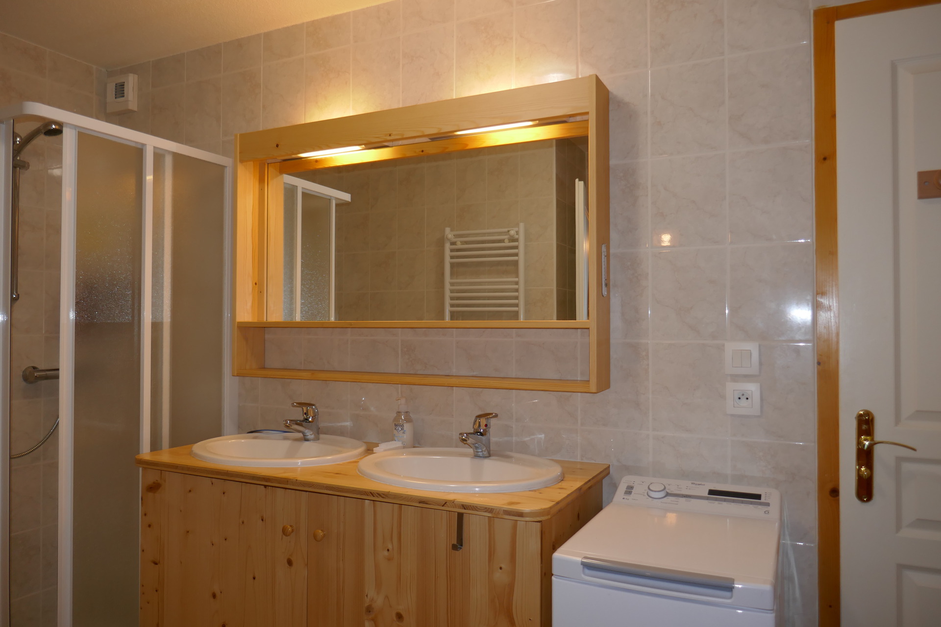 Entree / hall - Salle de bains (7m2) : Douche, lavabo double vasque, seche serviettes, WC, lave-linge - WC independant avec lave-mains (1.5m2) - Chambre 2 ( 7.5m2) : 2 lits, penderie, rangement, fenetre - Sejour (24 m2) : Canape, fauteuils, coin TV, acces balcon ouest - Coin cuisine ouvert sur sejour : Lave-vaisselle, refrigerateur congelateur, plaque vitroceramique 4 feux, four, micro-ondes.